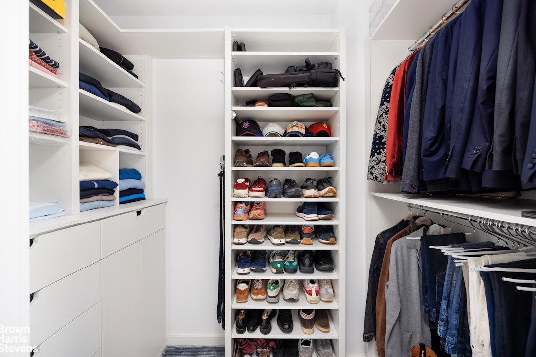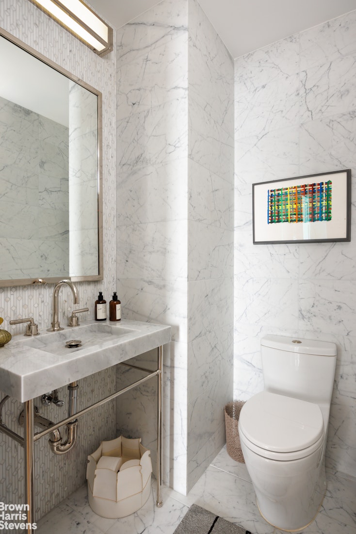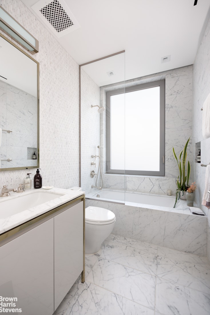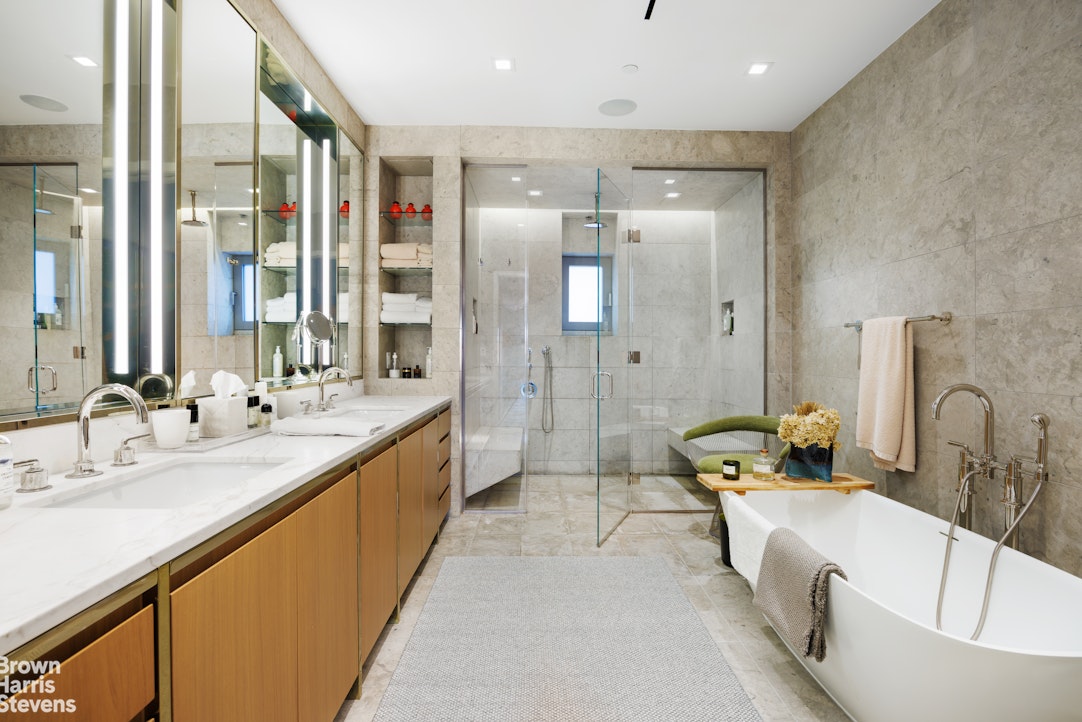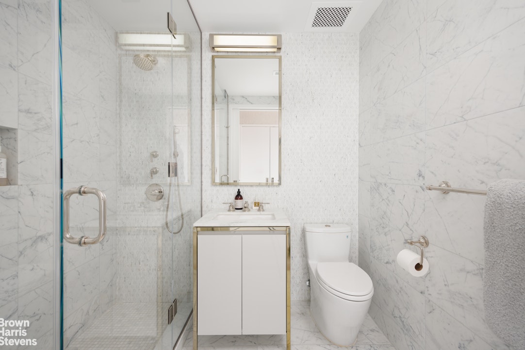 Private quarters are thoughtfully separated and equally impressive. The primary suite is a serene retreat, complete with a dressing area and over 28 linear feet of custom designed walk-in closet space. Its spa-like, windowed bathroom features a beautiful walnut double vanity, deep soaking tub, and oversized glass-enclosed shower, finished in exquisite Calacatta and limestone. Additional bedrooms offer open city views and are complemented by beautifully appointed bathrooms.