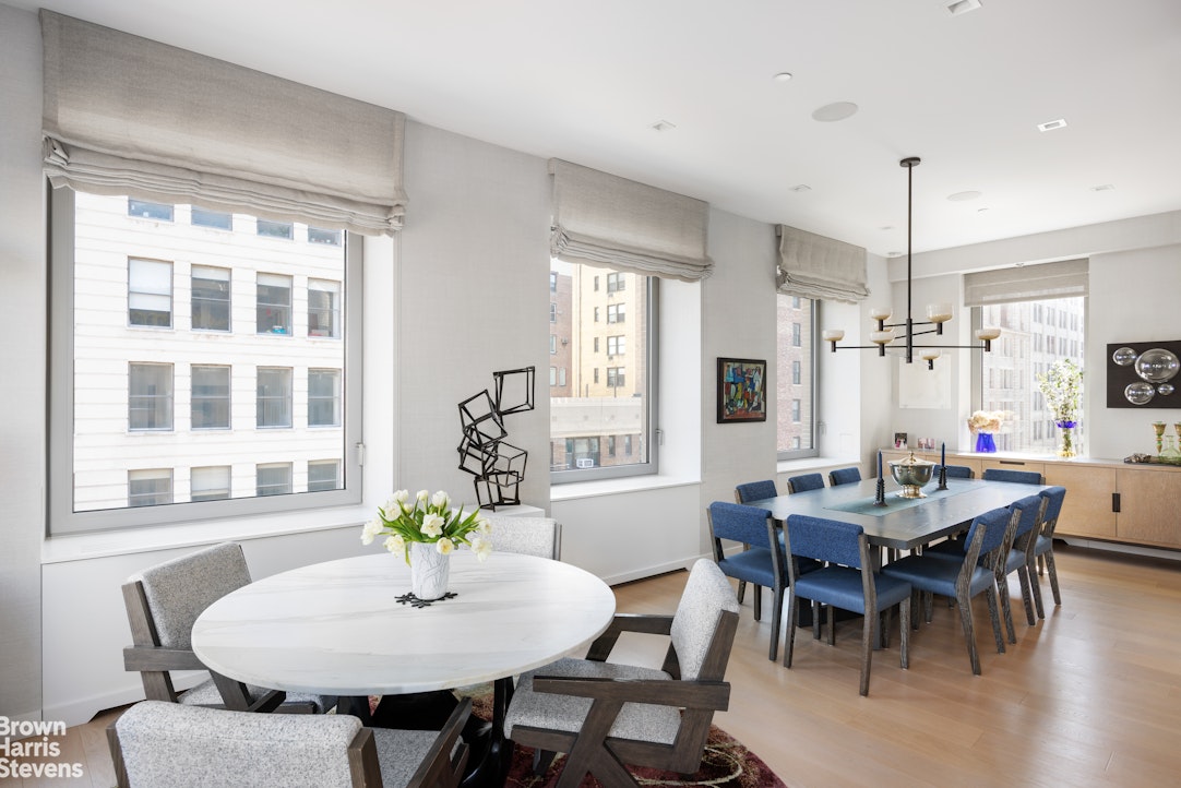 A private elevator opens directly into a grand entrance gallery, leading to expansive corner living and dining areas framed by 16 oversized windows and nearly 11-foot ceilings. Flooded with natural light from both north and south exposures, these spaces offer an airy, loft-like feel while maintaining a sense of intimacy and sophistication.
