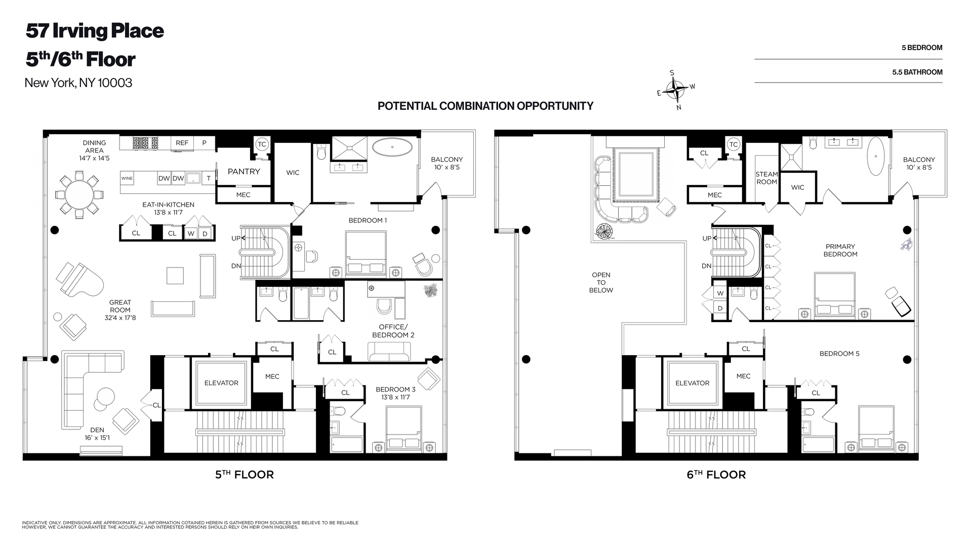 Unprecedented opportunity to combine two sublime full-floor residences overlooking historic Gramercy with over 100 linear feet of floor to ceiling glass, this is your chance to achieve nearly every comfort on your wish list and create one of the city's finest modern residences at 57 Irving Place, New York, NY 10003, where 5-star boutique Condominium living meets privacy in prime Gramercy.