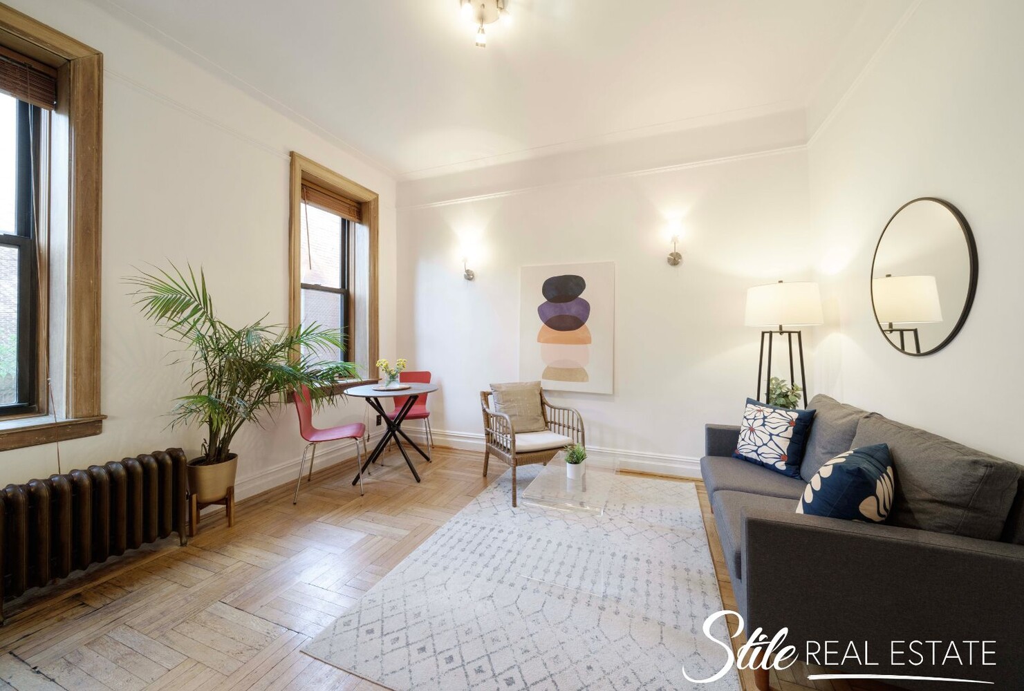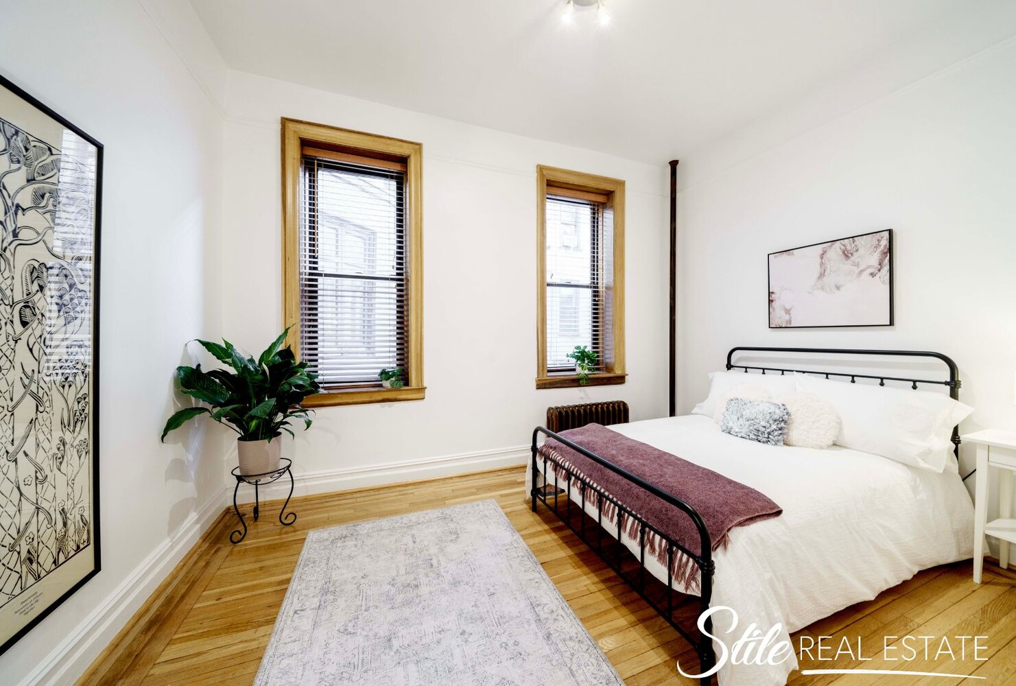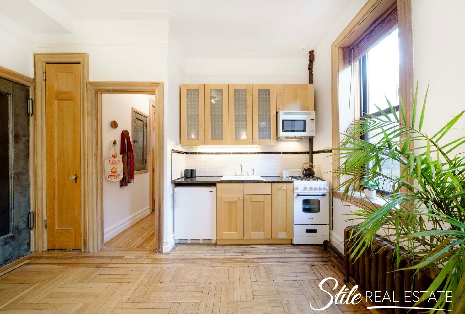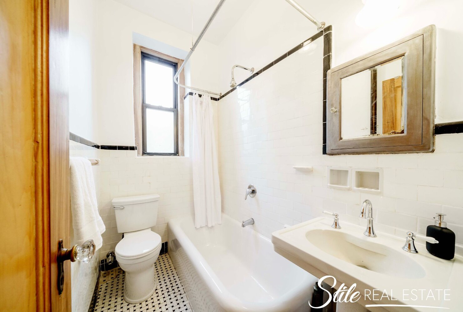 The spacious bedroom easily accommodates a queen or king-sized bed along with dressers and additional storage. The kitchen is equipped with wood cabinetry with frosted glass panels, a sleek black granite countertop, a porcelian sink, and a new stove. The windowed, tiled bathroom retains its classic pre-war charm with original details and there is a cedar closet in the hallway. A large storage unit in the basement is also included in the sale price!