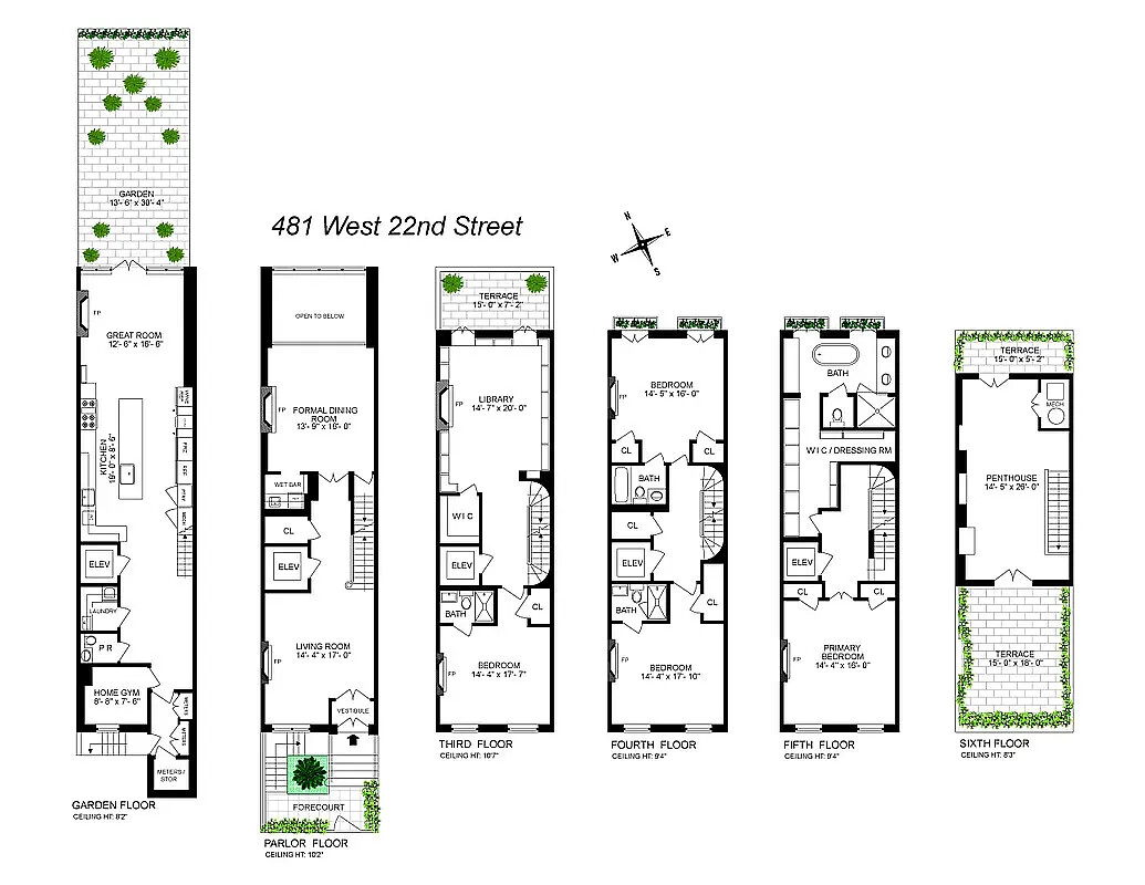 481 West 22nd Street is a beautifully reimagined six-story townhouse offering approximately 5,000 square feet of interior space and 1,250 square feet of outdoor living. The home features 4 bedrooms and 5.5 bathrooms, an elevator, and multiple outdoor areas: a front garden, a rear garden, a terrace off the library, and two penthouse terraces.