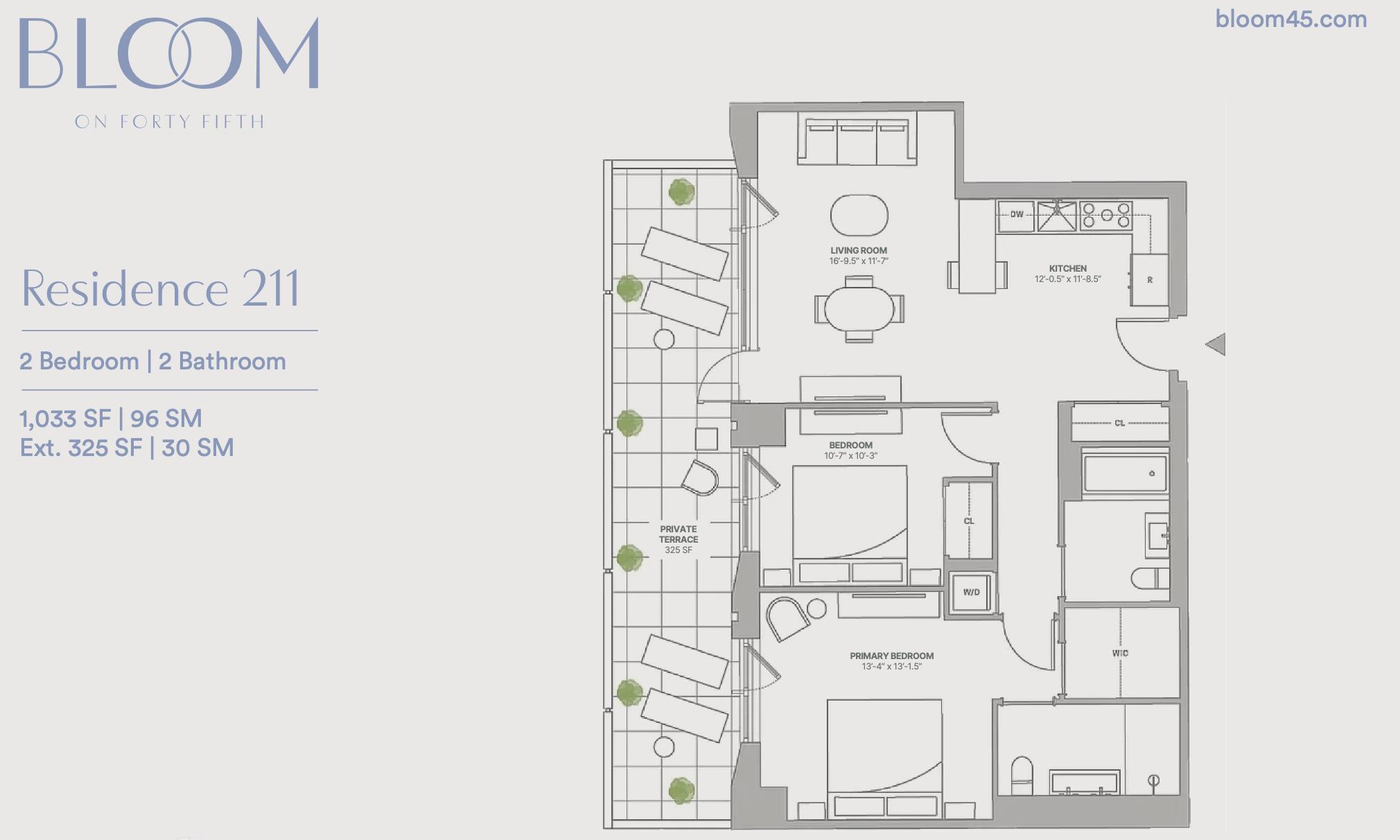 Introducing Unit #211 a two-bedroom, two bathroom home with an expansive private outdoor space running the entire length of the home! This home exemplifies luxury redefined at the newly reimagined Bloom on Forty Fifth. This exceptional condominium has been elevated to set a new standard for city living.