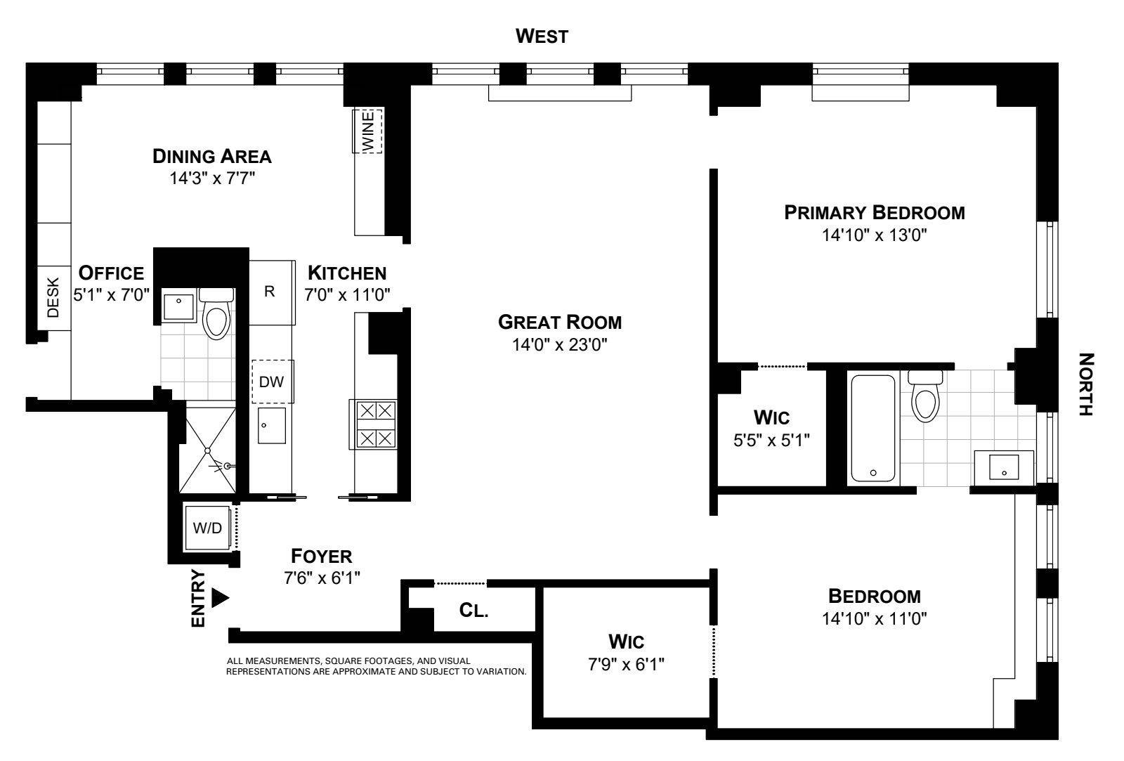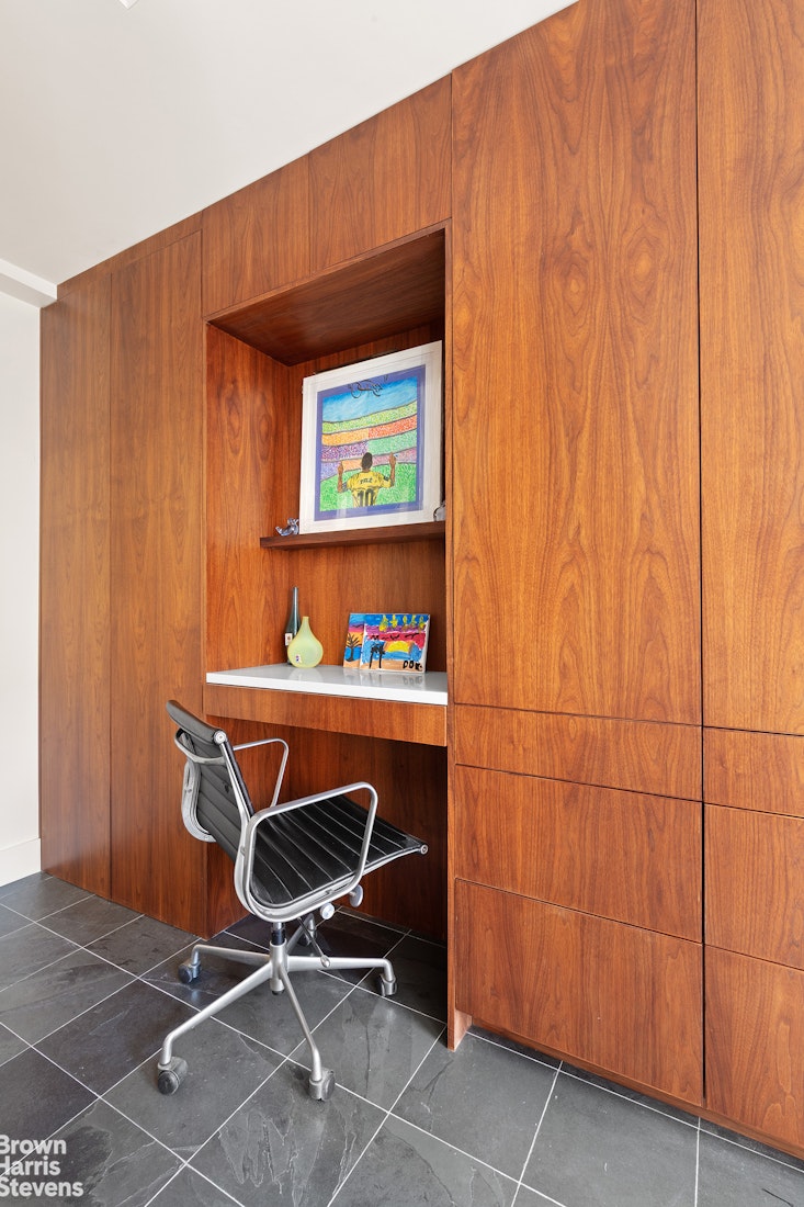 The ample great room features high ceilings, wide-plank hardwood floors, and multiple windows overlooking the city. At the center of the home, a windowed galley kitchen is appointed with warm walnut cabinetry extending floor to ceiling, white quartz countertops, and a professional-grade range. It opens directly to an eat-in dining area with a full wall of built-in storage and a wine refrigerator. A dedicated home office with a built-in desk and cabinetry, complete with a full bathroom with walk-in shower, is generous enough to serve as a third bedroom if desired.