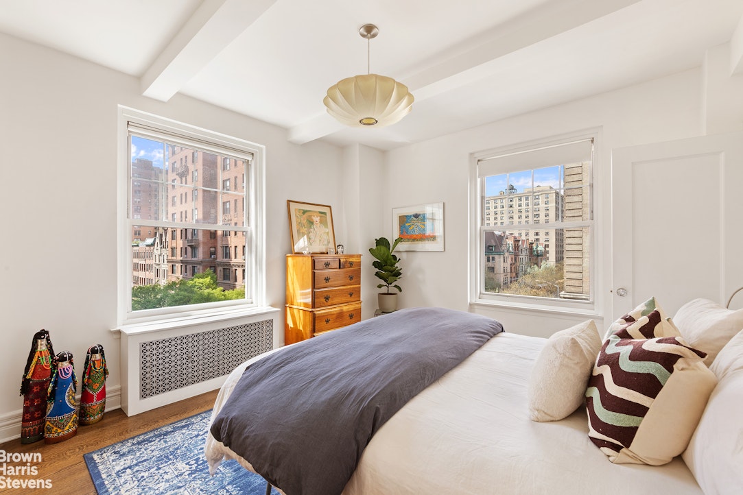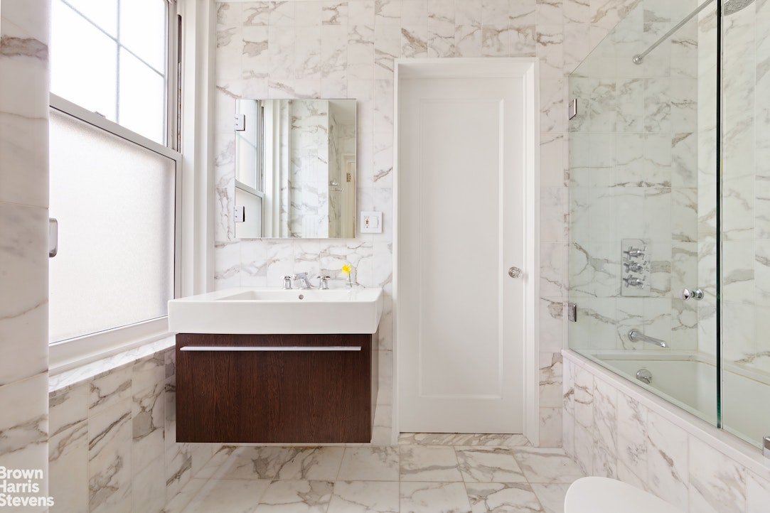 The corner primary bedroom enjoys three windows with open treetop views over West End Avenue and the surrounding streetscape, and is served by a walk-in closet and a renovated Calacatta marble bath with a glass-enclosed shower and floating vanity. The second bedroom is generously proportioned with its own walk-in closet. Both bedrooms share access to a second renovated bath. Additional highlights include an in-unit washer/dryer and substantial closet storage throughout.