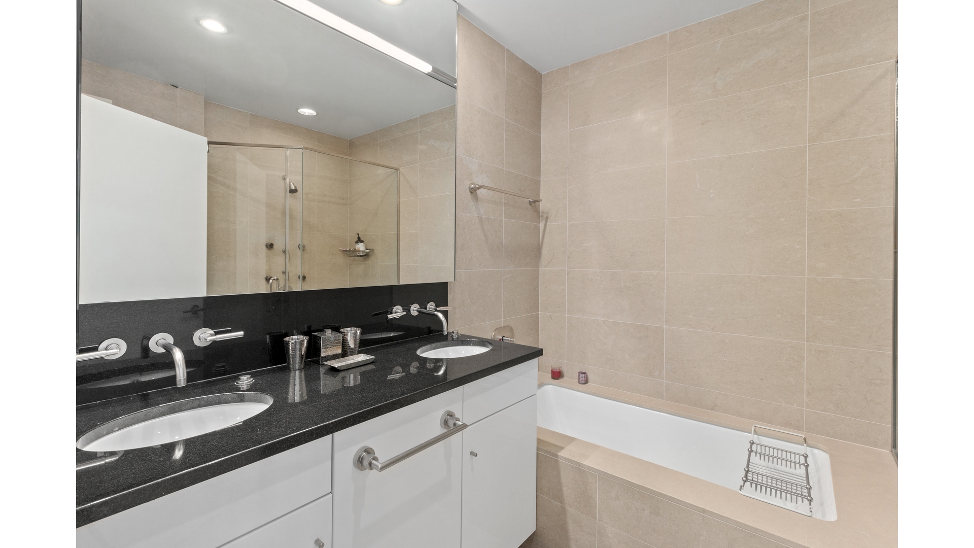 The bedrooms enjoy serene eastern and northern exposures and offer generous closet space. The primary suite is complemented by a luxurious five-fixture marble bathroom, complete with a soaking tub, glass-enclosed shower, and sleek black granite countertops.