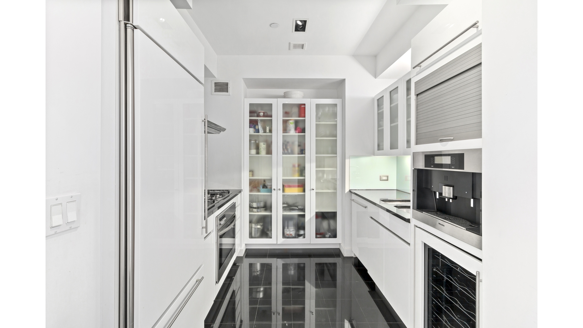 The chef's kitchen is outfitted with premium appliances, including Sub-Zero refrigeration, Miele appliances, and a built-in coffee system, along with white lacquer cabinetry and absolute black granite surfaces. Additional conveniences include an in-unit washer and dryer.