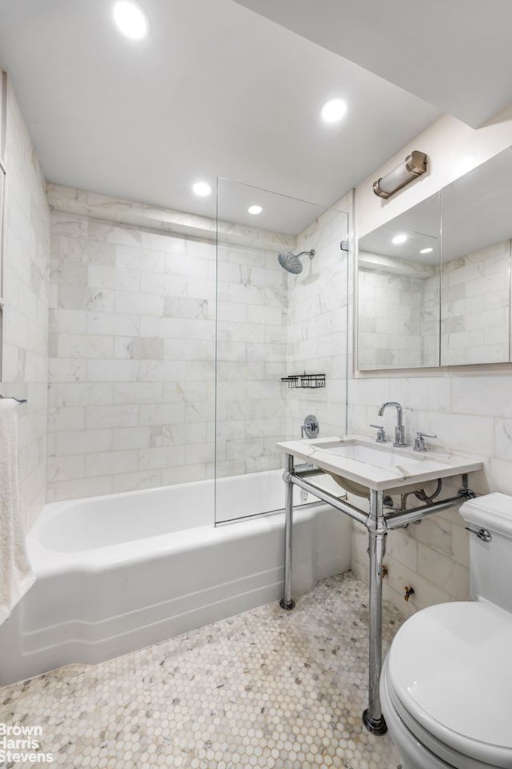 The bedroom fits a king sized bed, offers excellent closet space and still allows for a sitting area and additional storage. The bathroom has marble tile, mosaic details and is located off the bedroom hallway, making it perfect if you're entertaining guests. The apartment is quiet, sunny and features through the wall HVAC units.