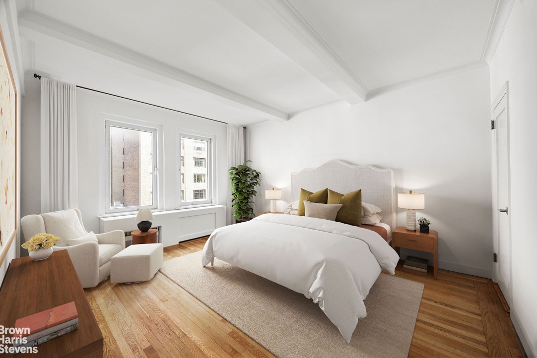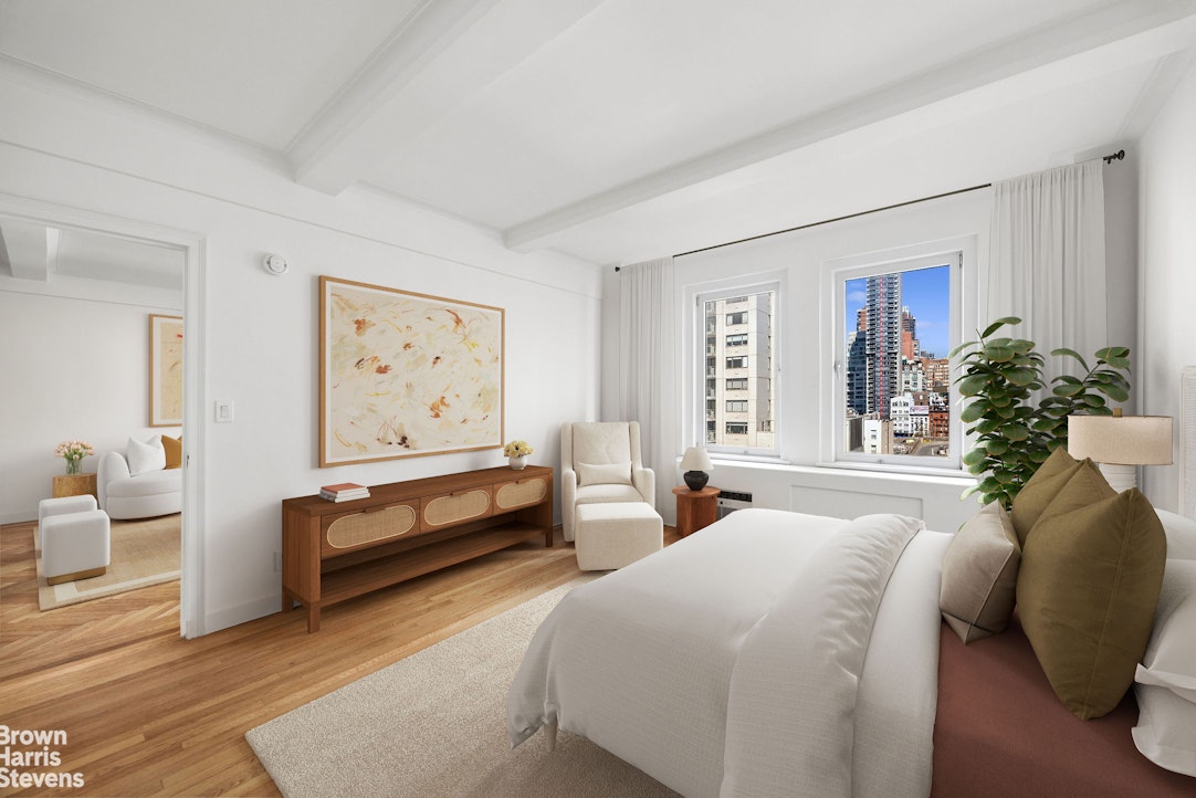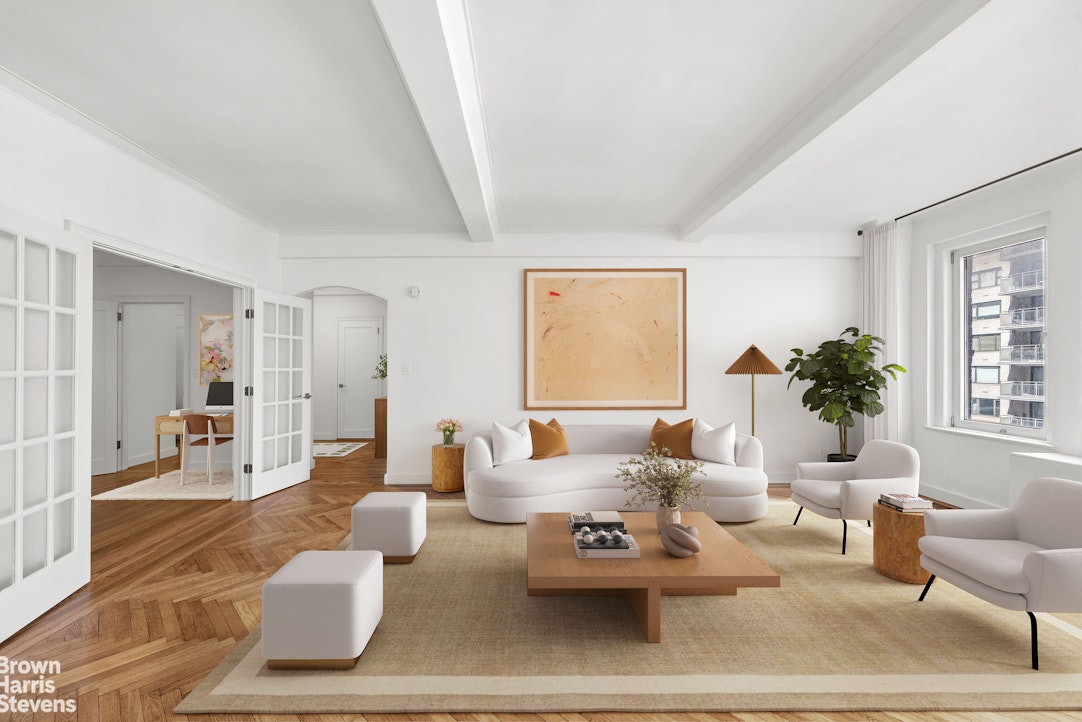 The expansive living space and the primary bedroom are bathed in natural light from oversized windows with northern exposure, offering open city views. The second bedroom features French doors with paned glass, allowing light to flow in from two exposures.