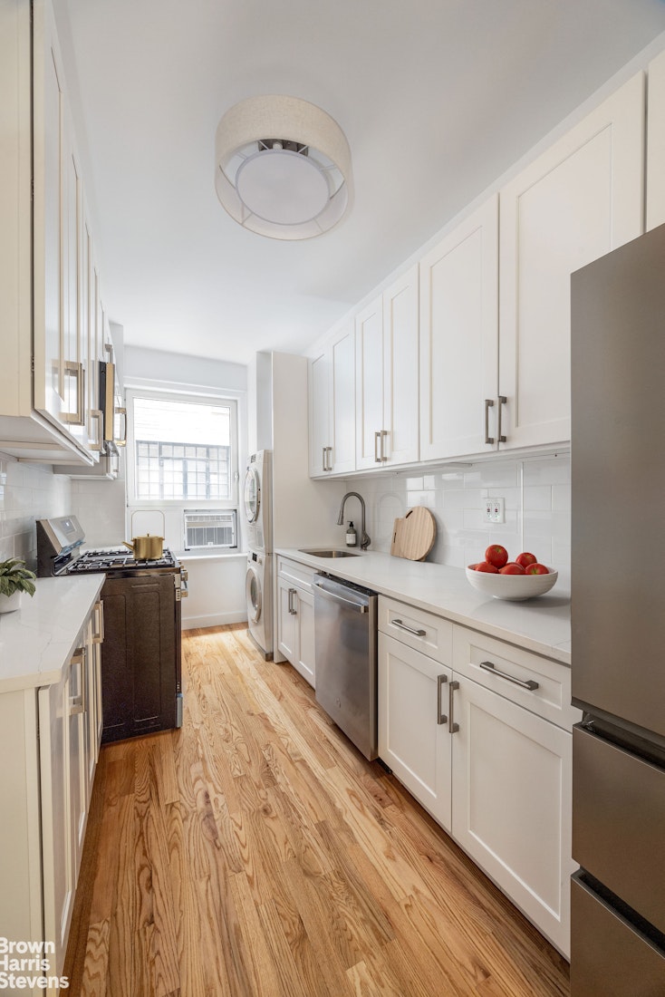 Each of the bedrooms has an en-suite bathroom, freshly renovated in a clean, classic style that complements the pre-war details throughout the apartment. Be the first to cook a delicious meal in the brand new kitchen, which features stone countertops and a stacked washer and dryer for convenience.