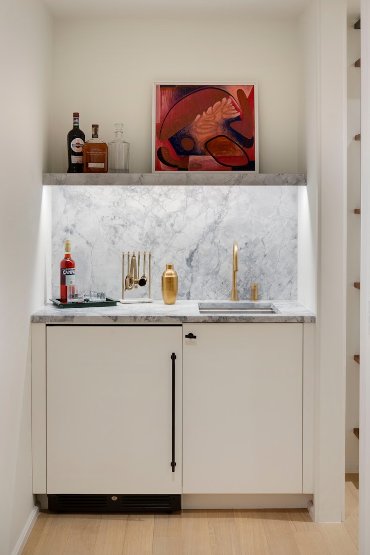 The eat-in kitchen is beautifully appointed with custom white oak cabinetry, Super White honed marble countertops and backsplash with a dramatic waterfall edge, and an oversized pantry for ample storage. A full suite of integrated JennAir appliances including refrigerator and freezer, convection oven, induction cooktop, microwave, and three-rack dishwasher, ensures best-in-class performance, while a built-in beverage refrigerator completes the space.