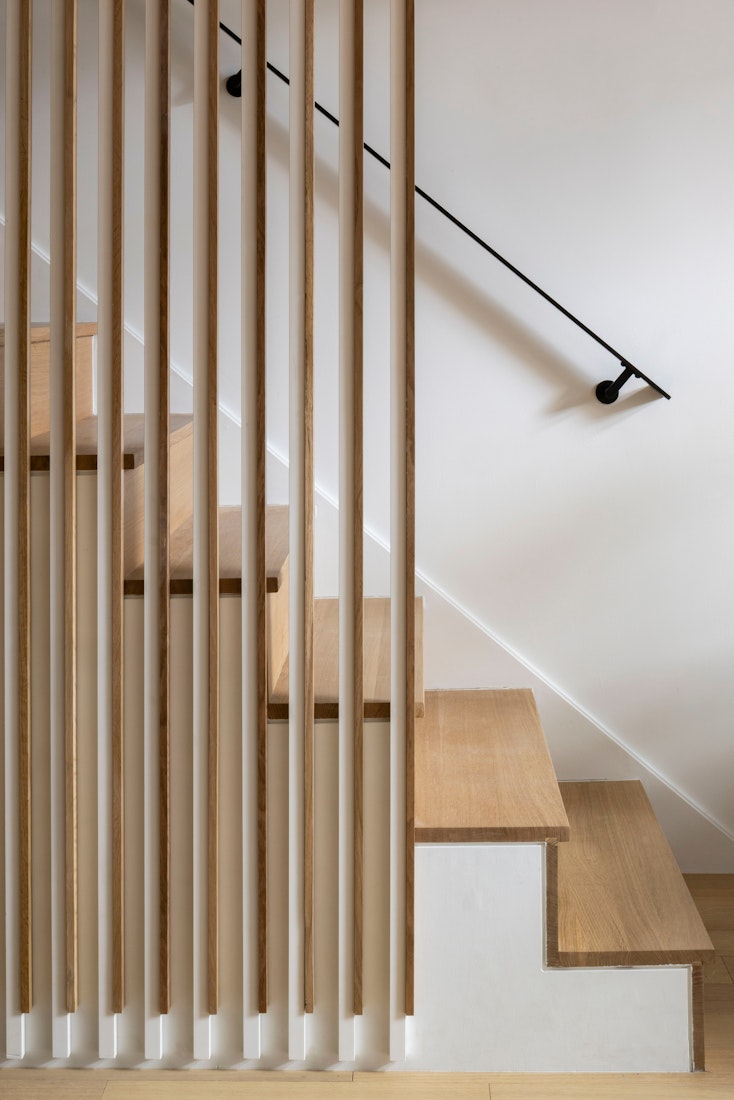 A slatted staircase enclosed in custom white oak ascends to the upper bedroom level. The primary suite is a serene retreat featuring dual walk-in closets, a separate linen closet, and an en-suite bath appointed with Italian Daino Reale marble, a custom dual oak vanity with brass detailing, and a wet room with a floor-to-ceiling glass shower and an oversized marble-framed tub. The secondary bedrooms are filled with natural light and include large closets and an adjacent full bath with a walnut vanity, Tundra Gray marble countertop, and porcelain tile finishes.