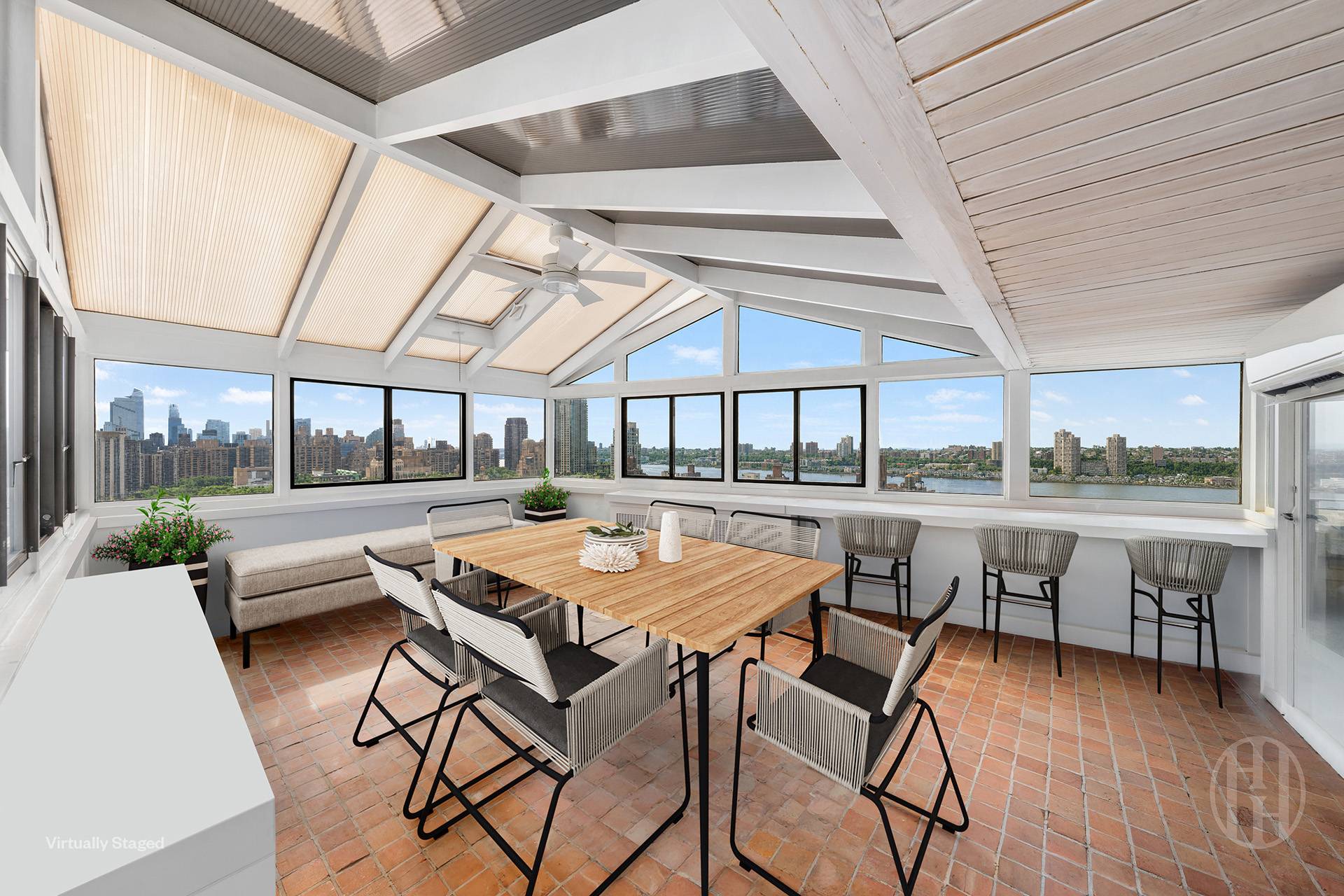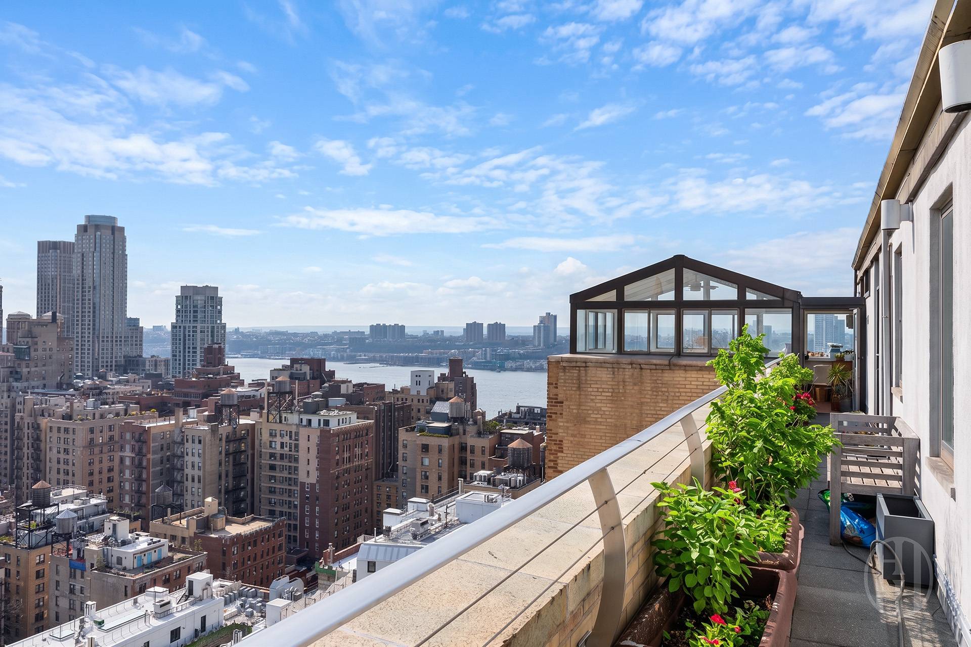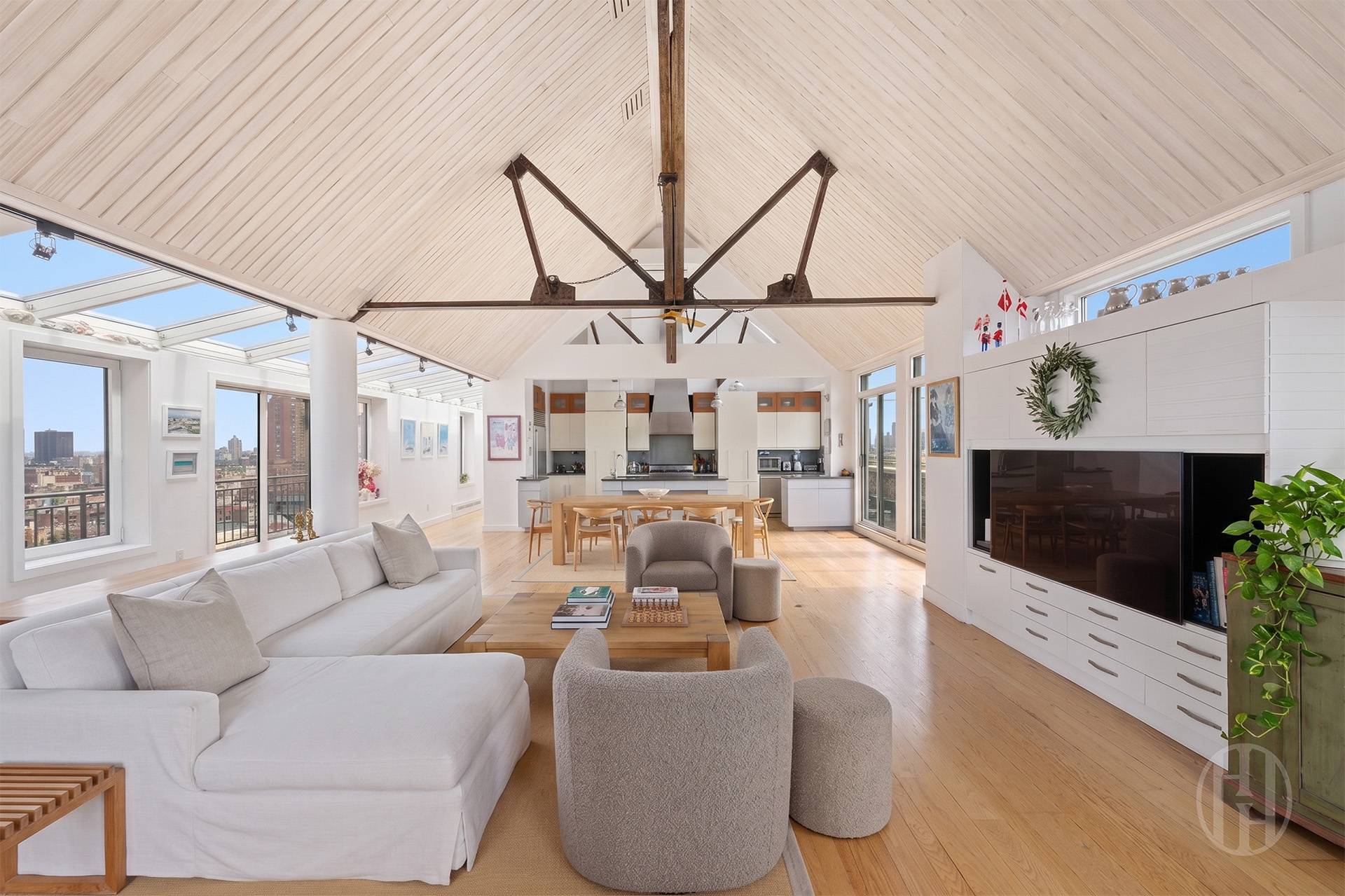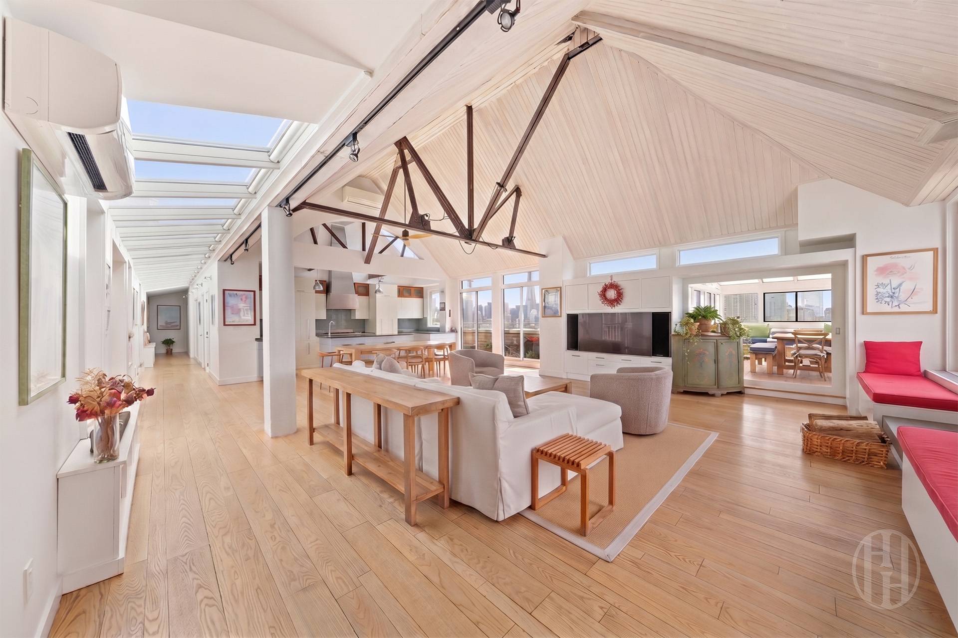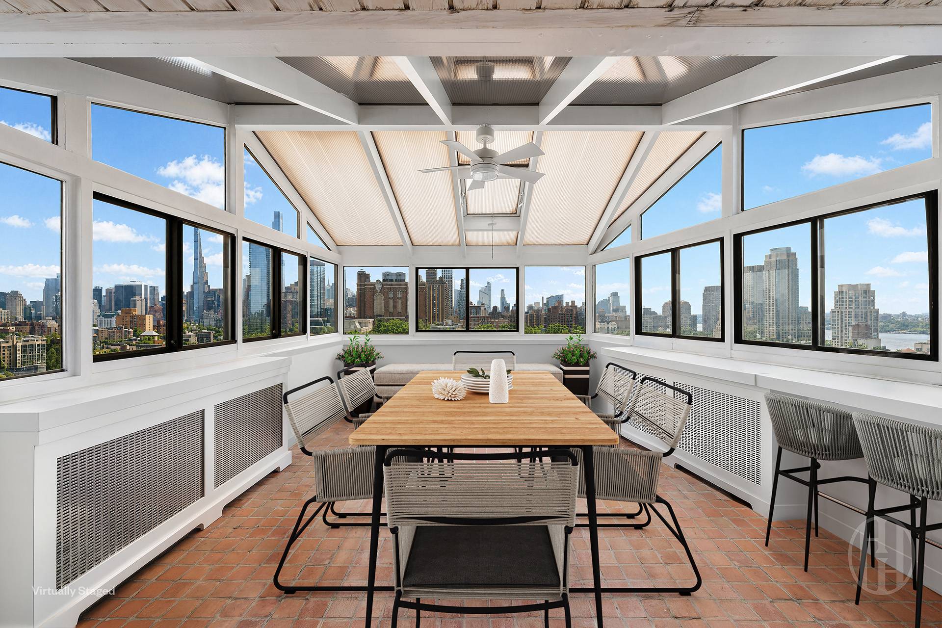 • Above Broadway. Above Everything. There is no apartment like this one. Perched atop the full-service Opera building on a floor entirely its own, this extraordinary five-bedroom penthouse feels like a countryside villa suspended above the city — distinguished by its signature red Spanish tile roof, dramatic sloped architecture, and wraparound terraces with unobstructed 360-degree views of Central Park, the Hudson River, the Midtown skyline, and the George Washington Bridge Step through the foyer and the city falls away. Vaulted 16-foot white-washed cedar ceilings soar above a voluminous great room flooded with light from triple exposures, a corridor of skylights, and south- and north-facing terraces. A stone-clad wood-burning fireplace anchors the open living and dining area, while a chef's kitchen flows seamlessly into the space designed for both grand entertaining and quiet mornings. A temperature-controlled glass solarium extends the living space further, offering year-round indoor-outdoor dining framed by the iconic skyline and the slow burn of Hudson River sunsets. Multiple terraces draw you outside at every hour of the day. The penthouse is organized into two distinct private wings. The eastern wing is anchored by a serene primary suite with Central Park views, direct terrace access, a wood-burning fireplace, dual walk-in closets, and a spa-like en-suite bath with both a soaking tub and shower, each positioned to capture river views. Above, a skylit studio offers a private and inspiring workspace. Three additional bedrooms, two versatile loft spaces, and a dedicated laundry room complete this wing. In the western wing, a beautifully renovated loft bedroom features double-height windows with sweeping river views, a fully reimagined en-suite bath with radiant heated floors, walk-in closet, and a mezzanine loft ideal as a studio or library. Wide-plank hardwood floors, multi-zone climate control, abundant custom built-ins, and storage throughout complete this exceptional home. Thirteen steps above the 24th floor, this is where the city ends and something rarer begins. Originally built as a neo-Gothic church and later reimagined as the Manhattan Towers Hotel, The Opera has been a landmark of the Upper West Side since 1930. The building offers 24-hour doorman and concierge service, a live-in resident manager, and bike storage. The Opera building sits at the heart of one of Manhattan's most coveted addresses. Central Park is steps away — the Reservoir path, the Ramble, the Great Lawn — a world class backyard for a home of this caliber. Riverside Park extends four miles along the Hudson, offering waterfront promenades and some of the best sunset views in the city. For those who appreciate the finest in dining and food, Zabar's, and Fairway are neighborhood institutions, while Broadway and Amsterdam Avenue are lined with acclaimed restaurants and boutiques befitting one of New York's most elegant residential corridors. Private showings by appt