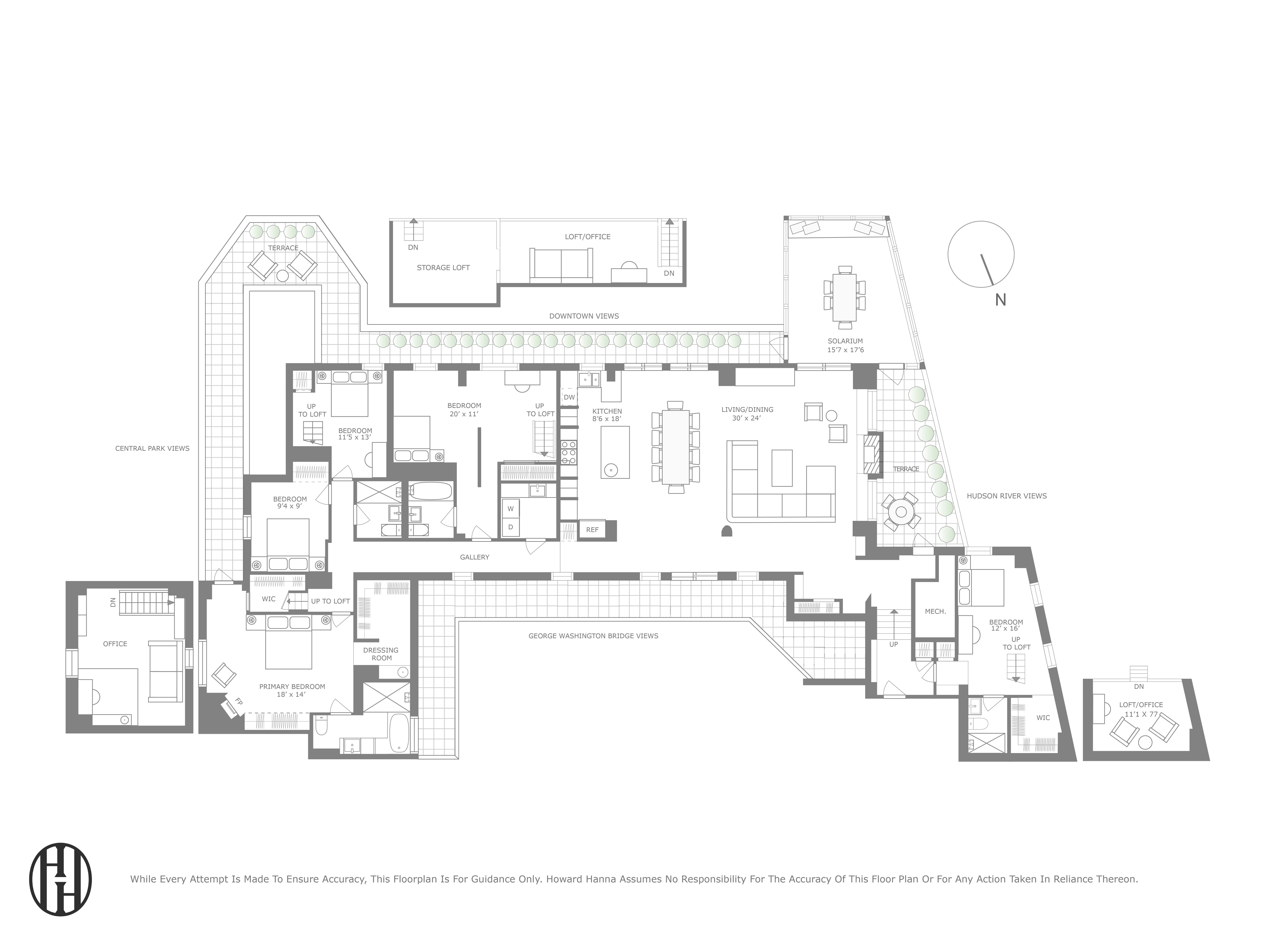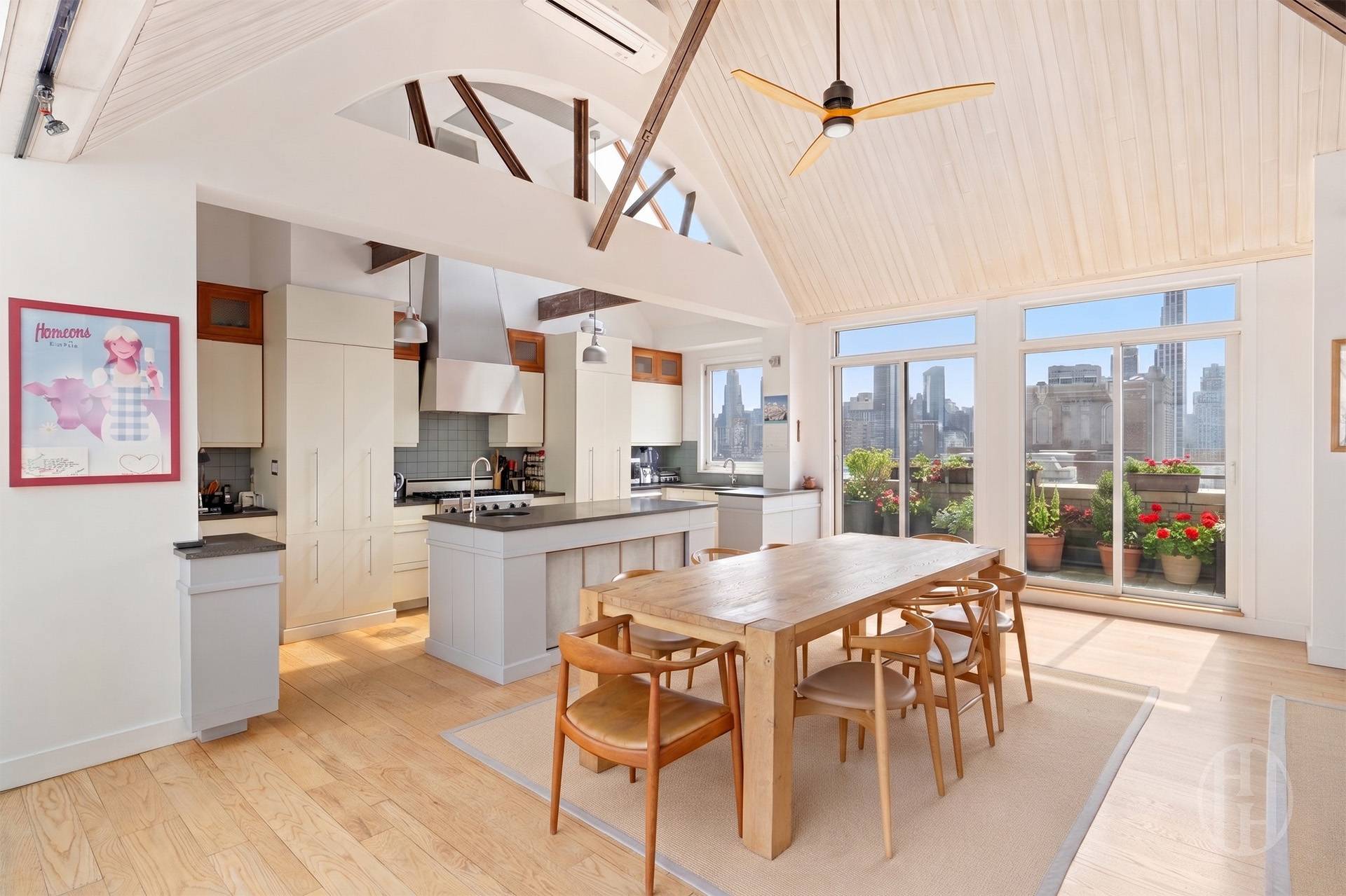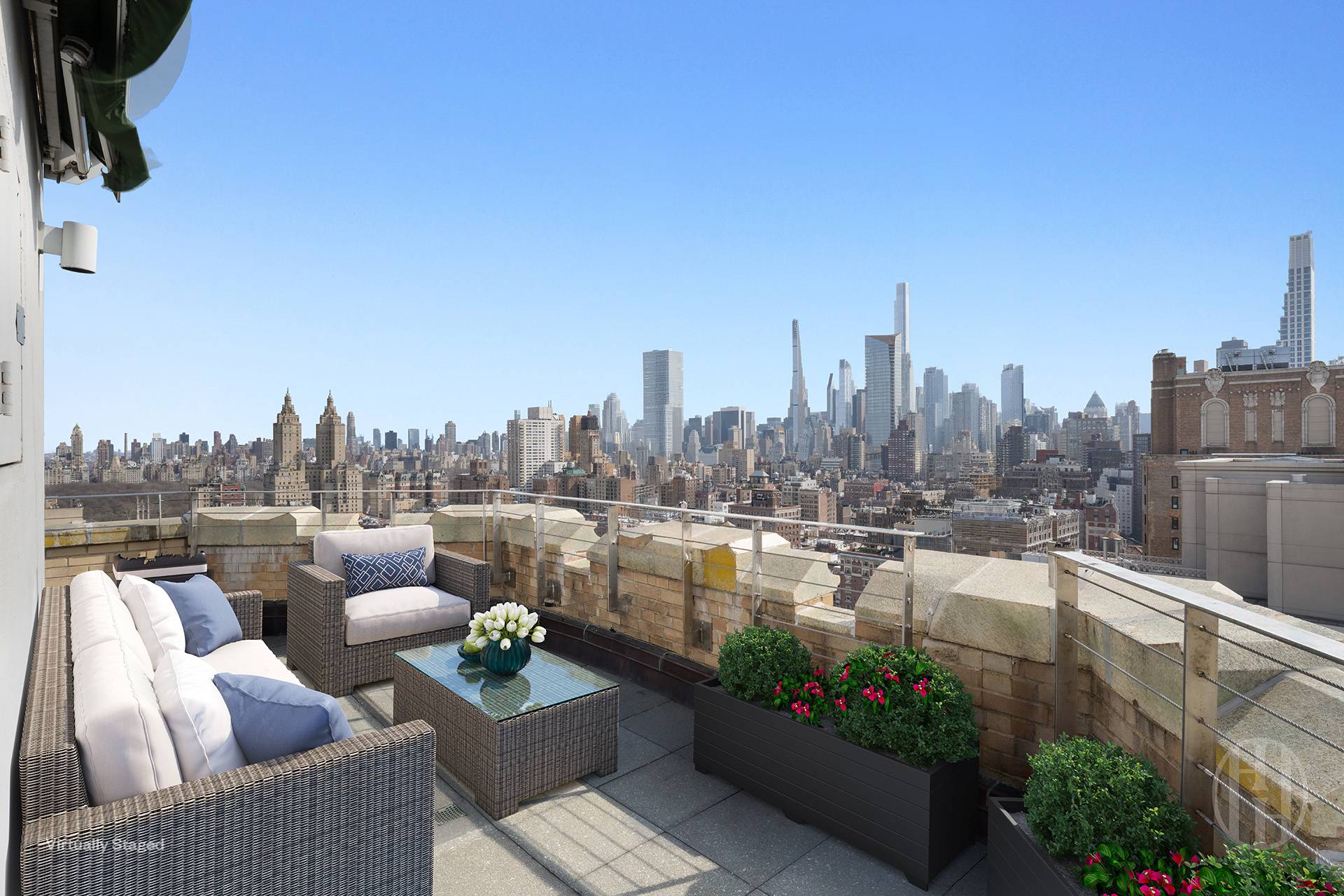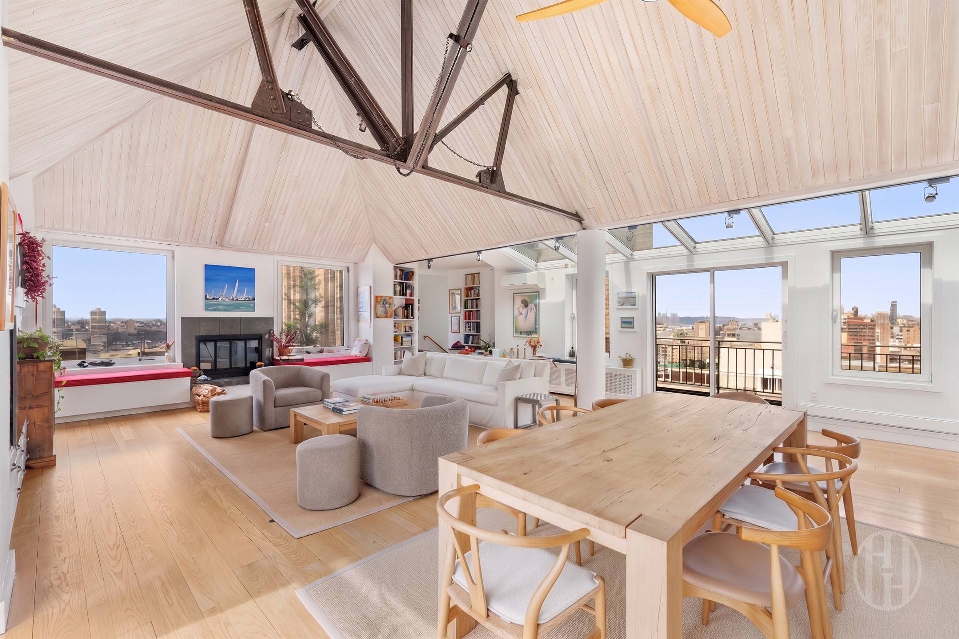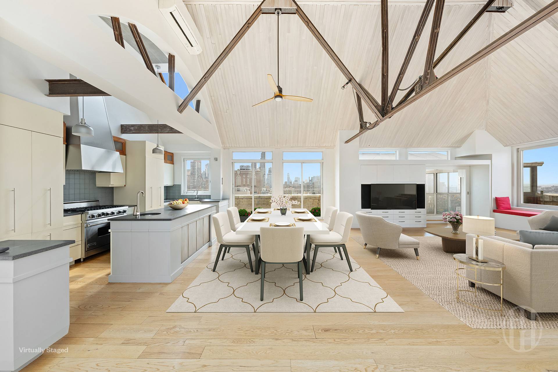 • Above Broadway. Above Everything. There is no apartment like this one. Perched atop the full-service Opera building on a floor entirely its own, this extraordinary five-bedroom penthouse feels like a countryside villa suspended above the city — distinguished by its signature red Spanish tile roof, dramatic sloped architecture, and wraparound terraces with unobstructed 360-degree views of Central Park, the Hudson River, the Midtown skyline, and the George Washington Bridge Step through the foyer and the city falls away. Vaulted 16-foot white-washed cedar ceilings soar above a voluminous great room flooded with light from triple exposures, a corridor of skylights, and south- and north-facing terraces. A stone-clad wood-burning fireplace anchors the open living and dining area, while a chef's kitchen flows seamlessly into the space designed for both grand entertaining and quiet mornings. A temperature-controlled glass solarium extends the living space further, offering year-round indoor-outdoor dining framed by the iconic skyline and the slow burn of Hudson River sunsets. Multiple terraces draw you outside at every hour of the day. The penthouse is organized into two distinct private wings. The eastern wing is anchored by a serene primary suite with Central Park views, direct terrace access, a wood-burning fireplace, dual walk-in closets, and a spa-like en-suite bath with both a soaking tub and shower, each positioned to capture river views. Above, a skylit studio offers a private and inspiring workspace. Three additional bedrooms, two versatile loft spaces, and a dedicated laundry room complete this wing. In the western wing, a beautifully renovated loft bedroom features double-height windows with sweeping river views, a fully reimagined en-suite bath with radiant heated floors, walk-in closet, and a mezzanine loft ideal as a studio or library. Wide-plank hardwood floors, multi-zone climate control, abundant custom built-ins, and storage throughout complete this exceptional home. Thirteen steps above the 24th floor, this is where the city ends and something rarer begins. Originally built as a neo-Gothic church and later reimagined as the Manhattan Towers Hotel, The Opera has been a landmark of the Upper West Side since 1930. The building offers 24-hour doorman and concierge service, a live-in resident manager, and bike storage. The Opera building sits at the heart of one of Manhattan's most coveted addresses. Central Park is steps away — the Reservoir path, the Ramble, the Great Lawn — a world class backyard for a home of this caliber. Riverside Park extends four miles along the Hudson, offering waterfront promenades and some of the best sunset views in the city. For those who appreciate the finest in dining and food, Zabar's, and Fairway are neighborhood institutions, while Broadway and Amsterdam Avenue are lined with acclaimed restaurants and boutiques befitting one of New York's most elegant residential corridors. Private showings by appt