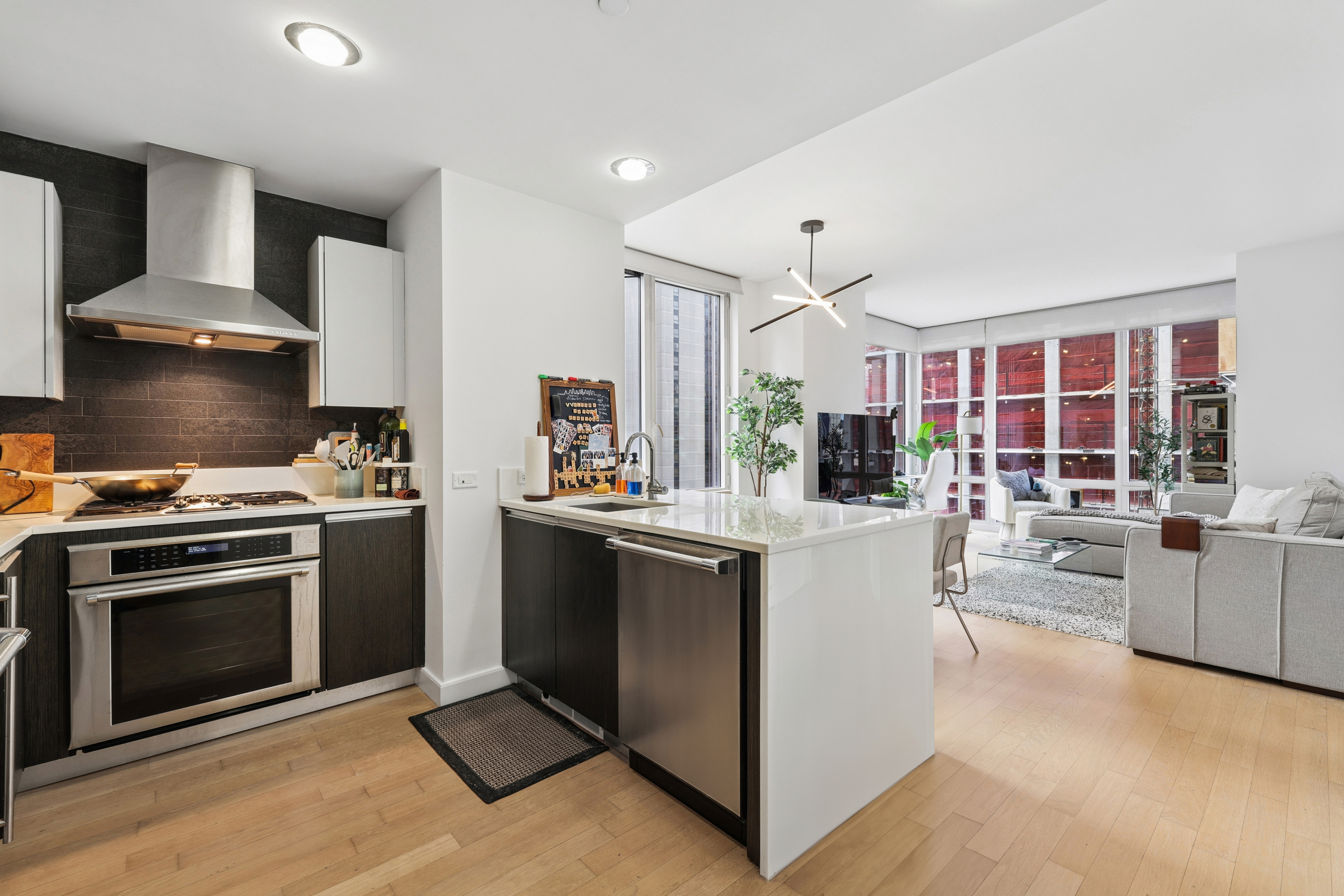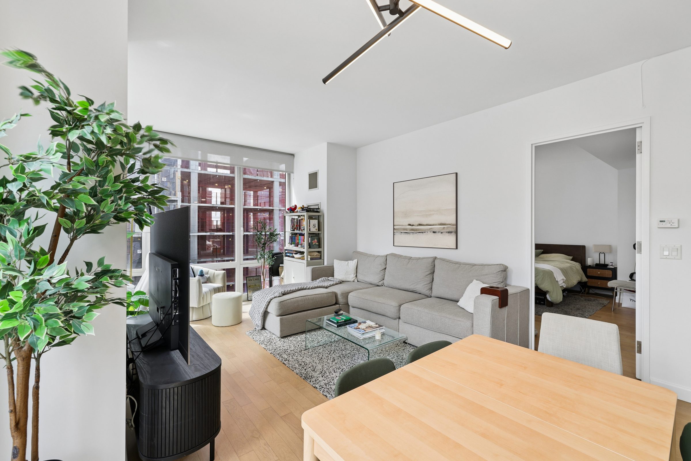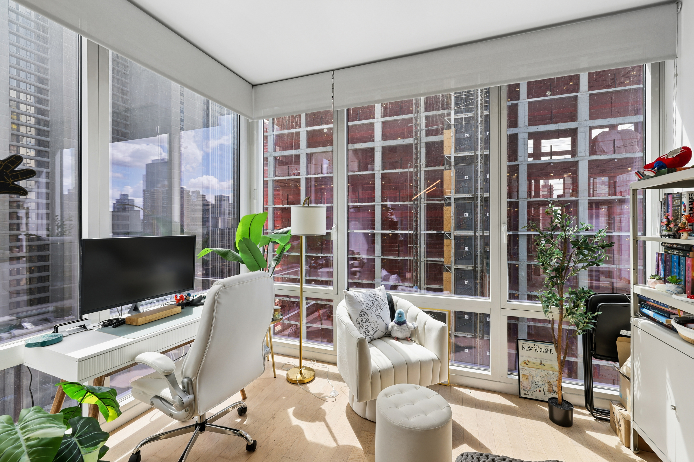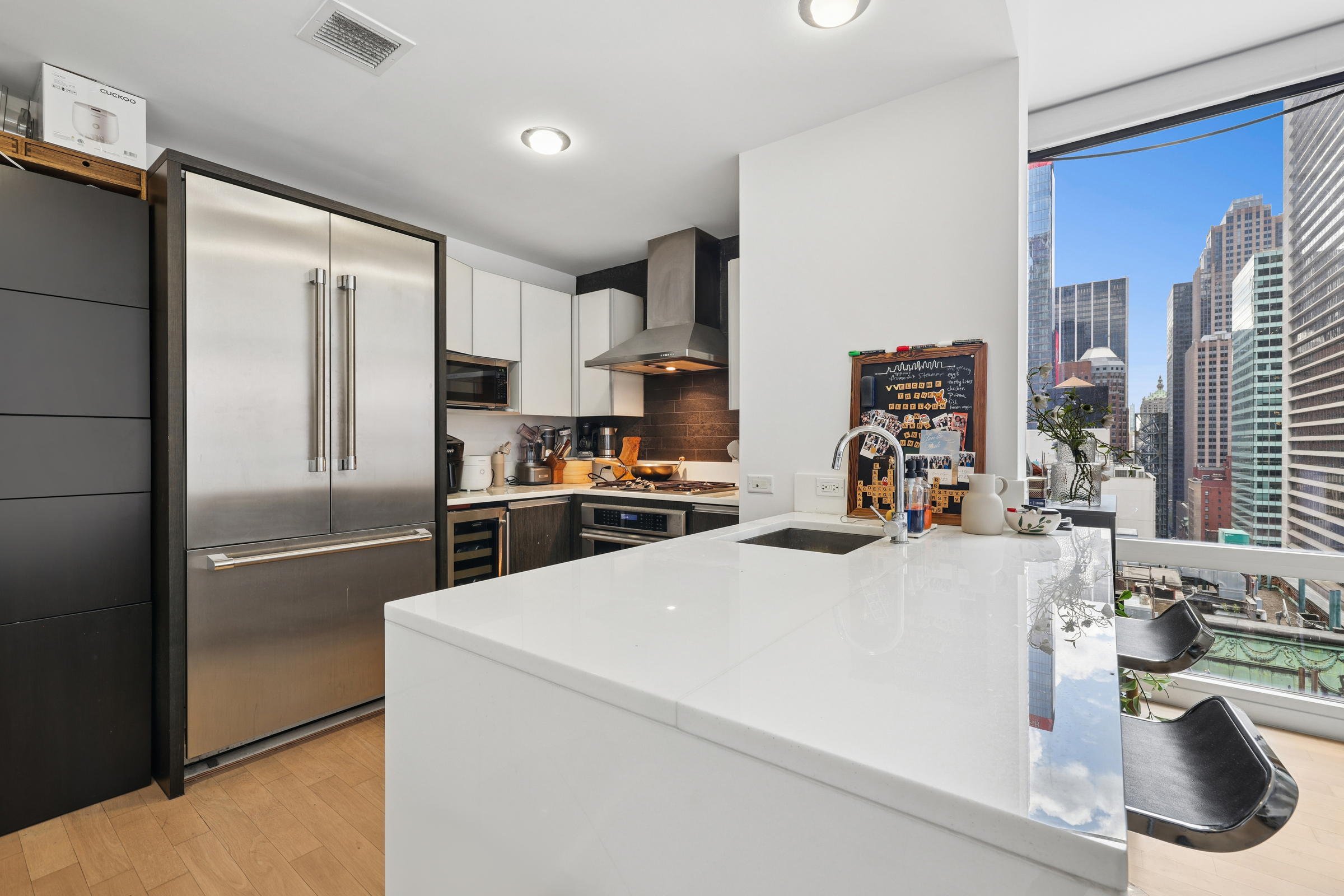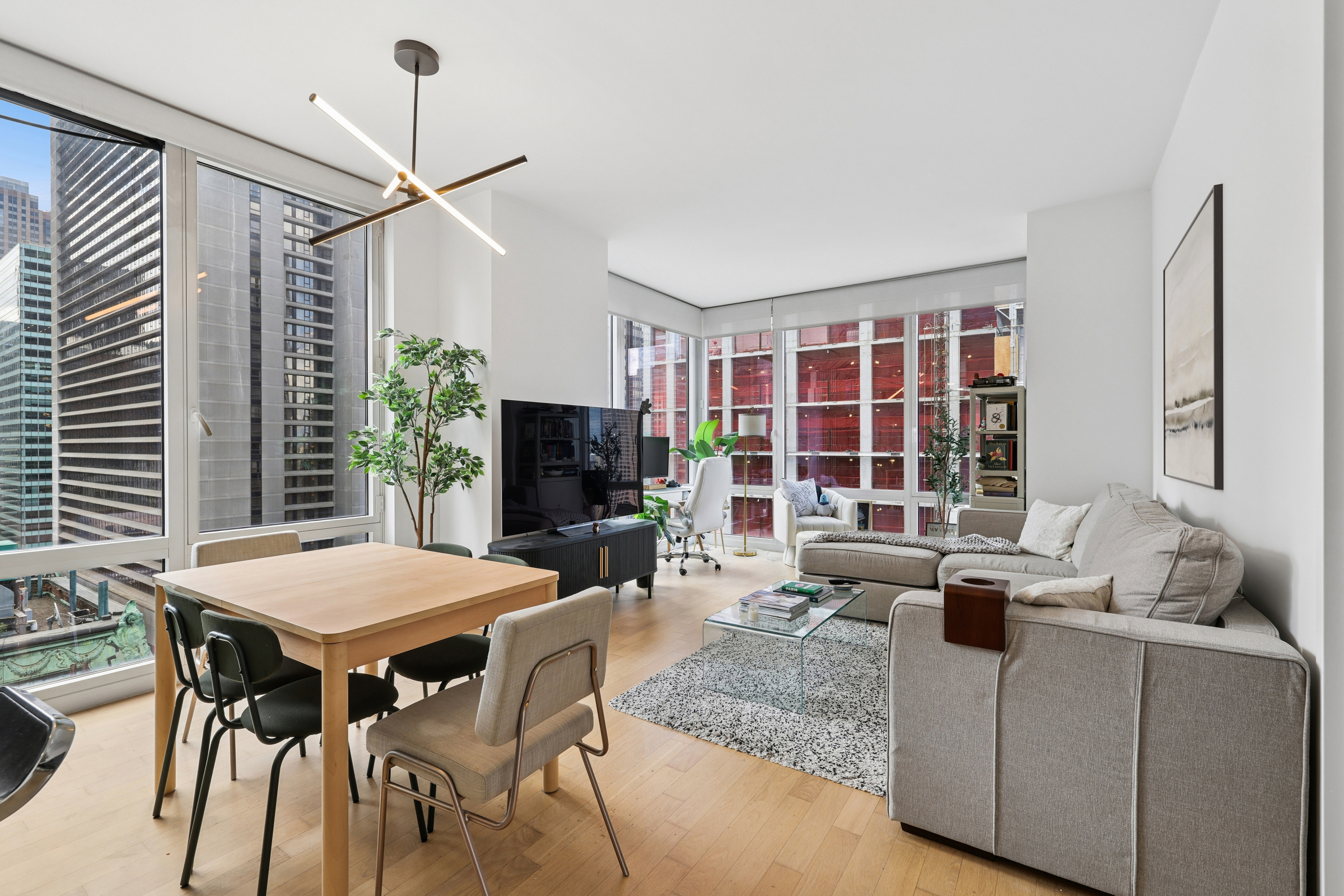 Positioned on the 22nd floor, Residence 2204 is a bright corner one bedroom, one and a half bath home with open city views and a thoughtfully designed layout for both living and entertaining. Wrapped in floor-to-ceiling windows, the corner living space benefits from south and west exposures, bringing in strong natural light throughout the day and offering open skyline views. The living and dining area flows seamlessly into a sleek, open kitchen outfitted with high-end stainless steel appliances, tempered glass finishes, and ample cabinetry. A proper entry foyer creates a natural sense of separation and leads to a private bedroom suite tucked away from the main living space. The primary bath is finished with refined stonework and a deep soaking tub, while a powder room adds convenience for guests. Additional features include hardwood flooring and an in-unit washer and dryer. The Platinum is a full-service condominium offering 24-hour doorman and concierge service, along with a full floor dedicated to wellness and lifestyle amenities. Residents enjoy a state-of-the-art fitness center, yoga studio, golf simulator, spa lounge with sauna and treatment areas, massage and recovery spaces, and a resident lounge with billiards. An outdoor terrace, cold storage, bicycle storage, valet services, and on-site parking further enhance daily living. Located in the heart of Midtown, moments from the Theater District, Restaurant Row, Bryant Park, and Central Park, and just off Times Square, the building offers immediate access to some of the city’s most iconic destinations while still providing a sense of separation from the energy of it all. Convenient access to the 1, 2, 3, 7, N, R, W, Q, A, C, and E subway lines makes getting anywhere in the city simple.