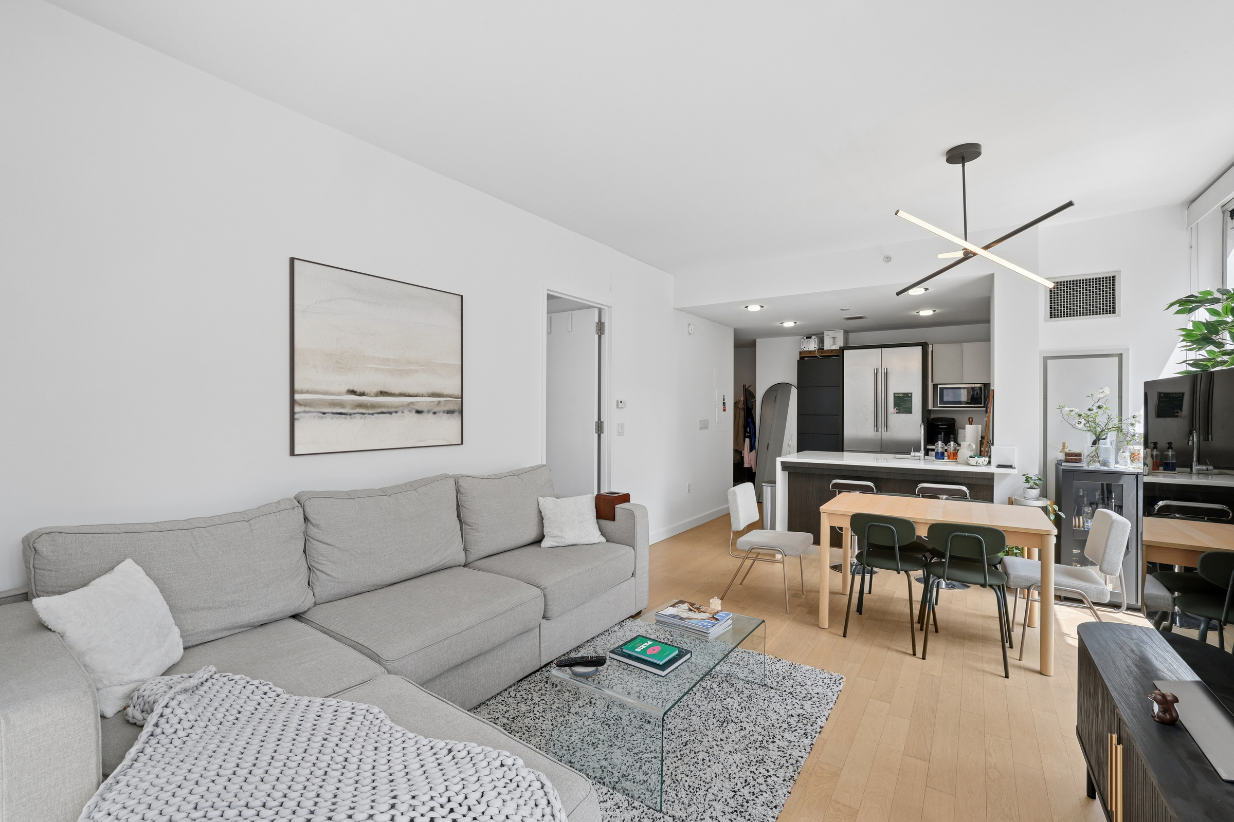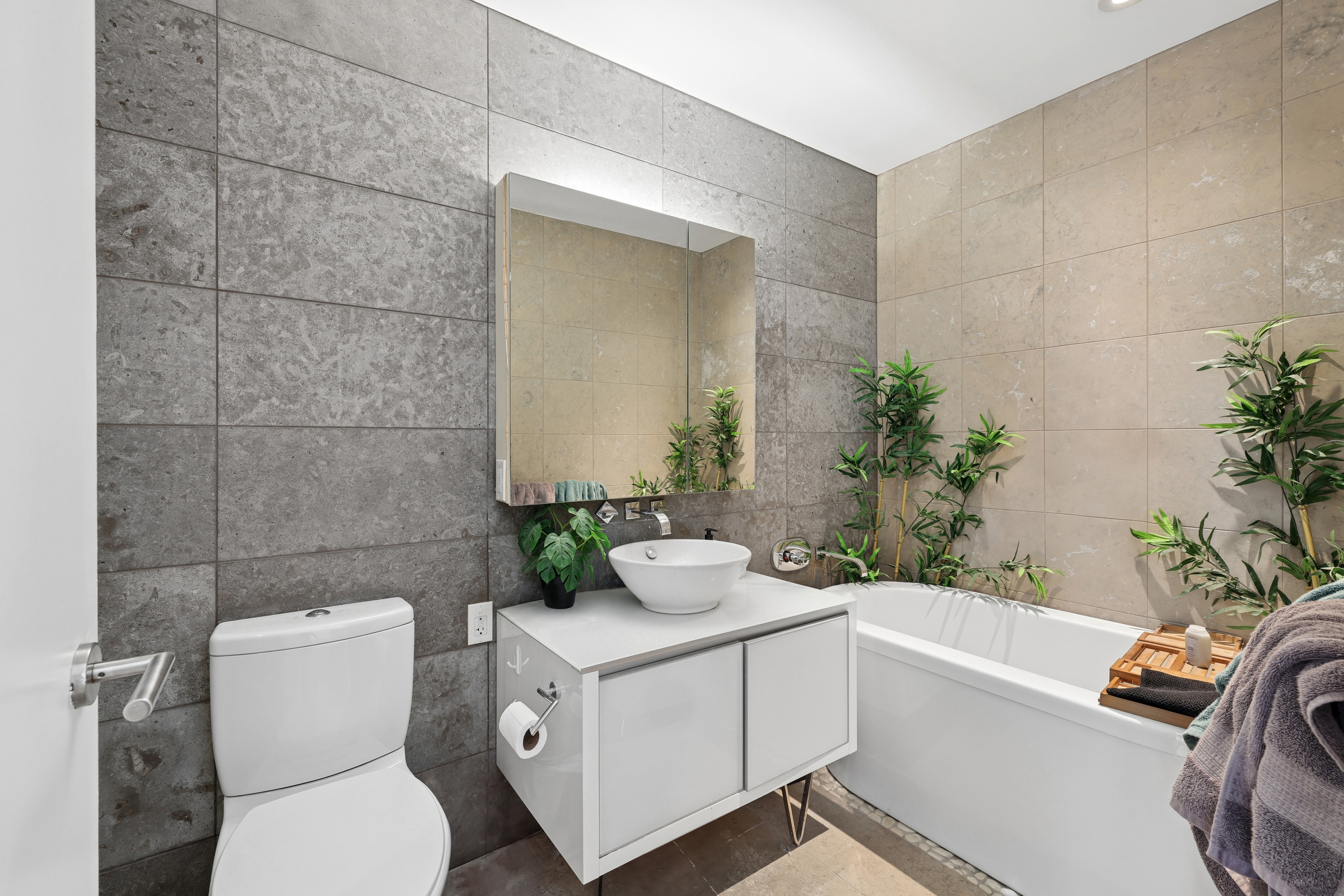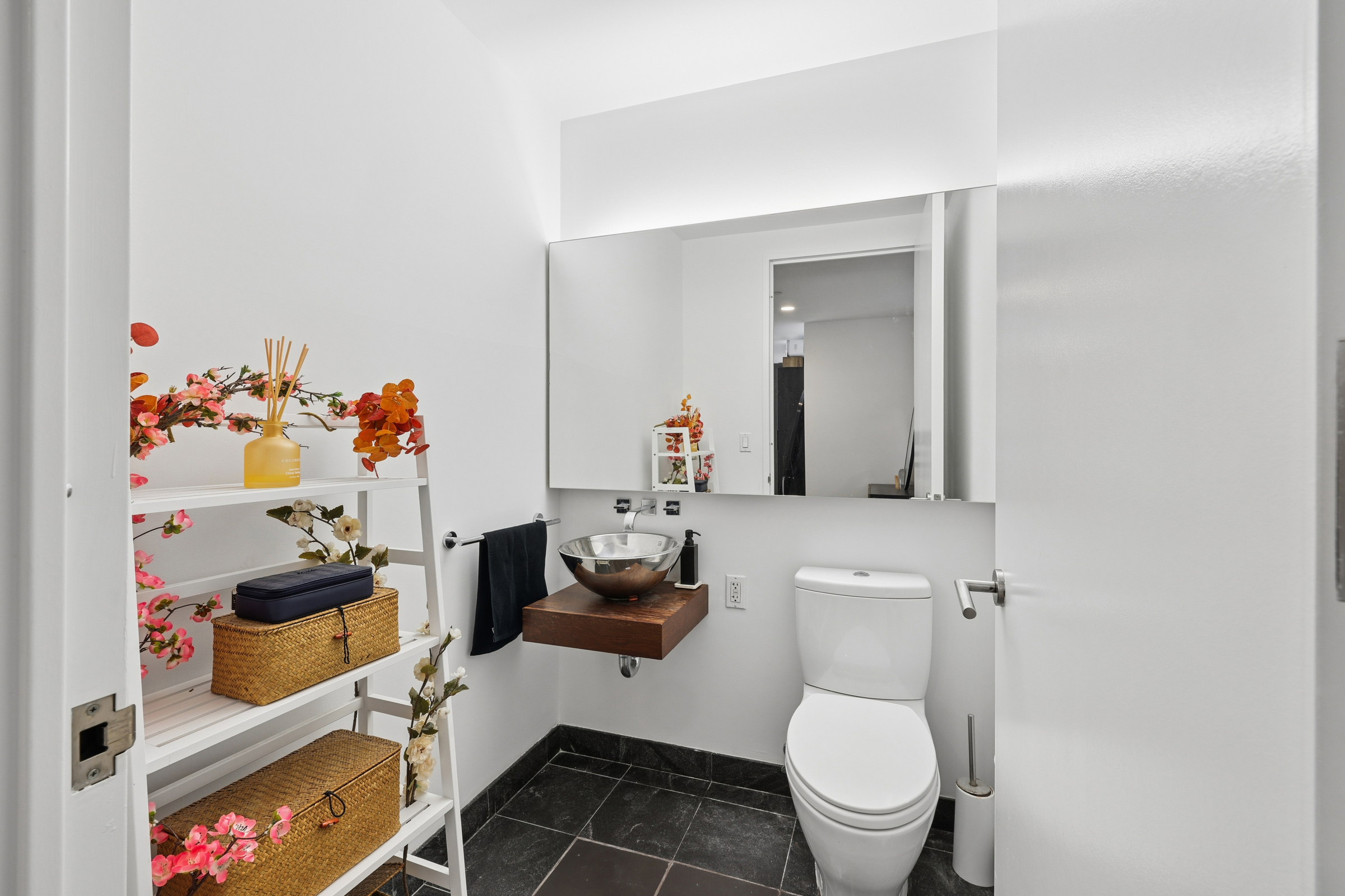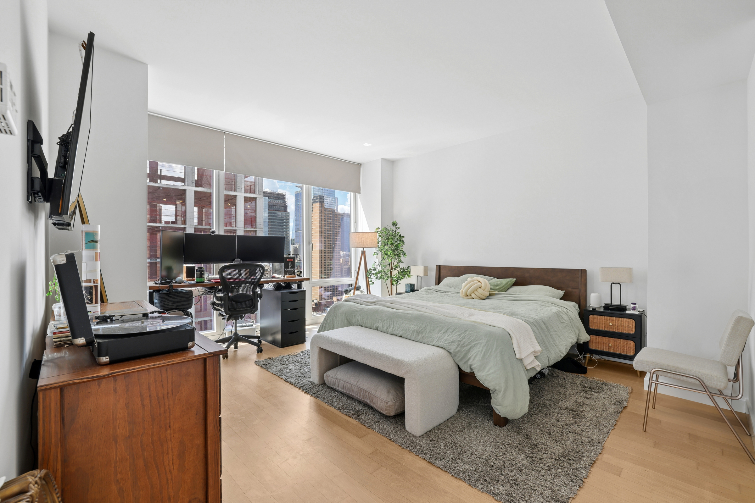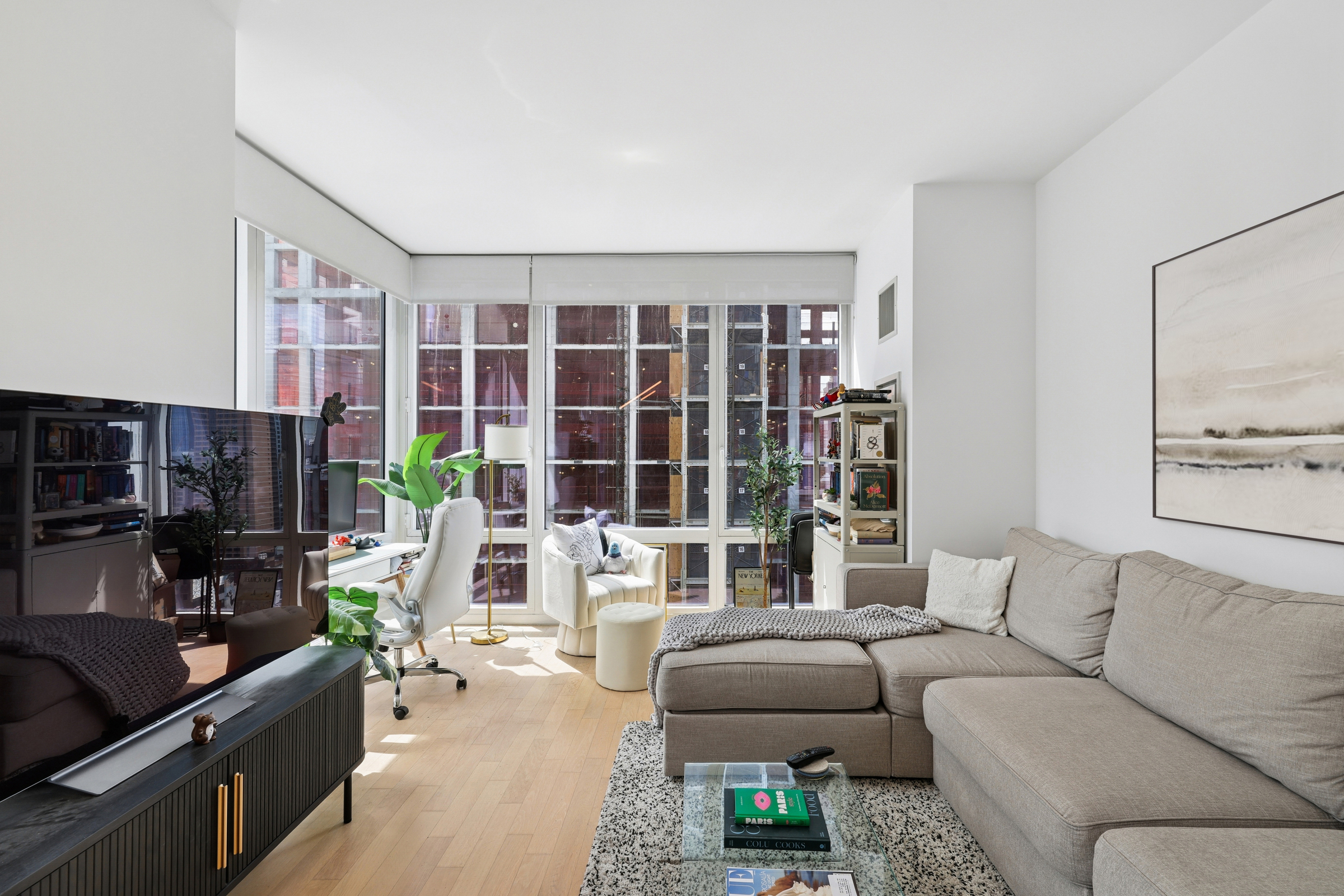 Positioned on the 22nd floor, Residence 2204 is a bright corner one bedroom, one and a half bath home with open city views and a thoughtfully designed layout for both living and entertaining. Wrapped in floor-to-ceiling windows, the corner living space benefits from south and west exposures, bringing in strong natural light throughout the day and offering open skyline views. The living and dining area flows seamlessly into a sleek, open kitchen outfitted with high-end stainless steel appliances, tempered glass finishes, and ample cabinetry. A proper entry foyer creates a natural sense of separation and leads to a private bedroom suite tucked away from the main living space. The primary bath is finished with refined stonework and a deep soaking tub, while a powder room adds convenience for guests. Additional features include hardwood flooring and an in-unit washer and dryer. The Platinum is a full-service condominium offering 24-hour doorman and concierge service, along with a full floor dedicated to wellness and lifestyle amenities. Residents enjoy a state-of-the-art fitness center, yoga studio, golf simulator, spa lounge with sauna and treatment areas, massage and recovery spaces, and a resident lounge with billiards. An outdoor terrace, cold storage, bicycle storage, valet services, and on-site parking further enhance daily living. Located in the heart of Midtown, moments from the Theater District, Restaurant Row, Bryant Park, and Central Park, and just off Times Square, the building offers immediate access to some of the city’s most iconic destinations while still providing a sense of separation from the energy of it all. Convenient access to the 1, 2, 3, 7, N, R, W, Q, A, C, and E subway lines makes getting anywhere in the city simple.