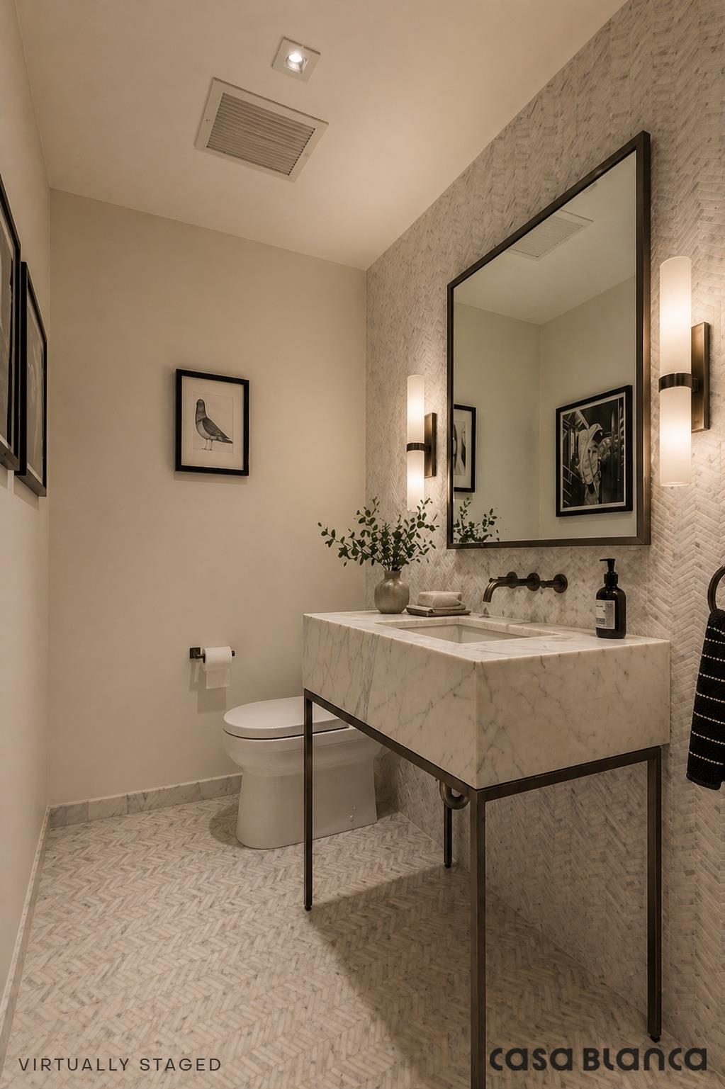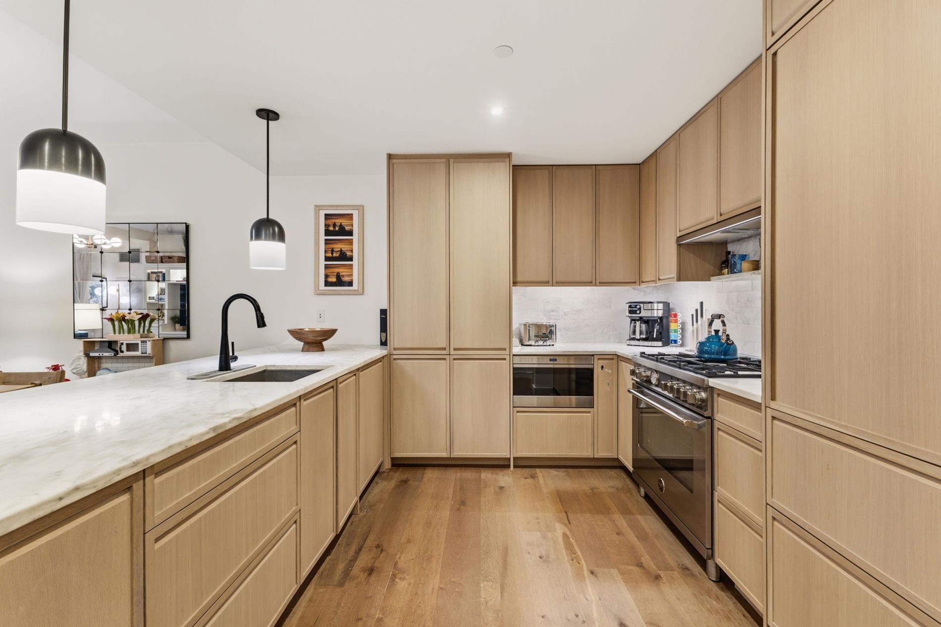 Interiors are thoughtfully crafted with a refined, modern sensibility. Wide-plank oak flooring, custom white oak cabinetry, and fully integrated appliances by Bertazzoni, Liebherr, and Bosch create a seamless and elevated living experience. Kitchens are anchored by honed Carrara marble waterfall countertops, while spa-like primary bathrooms feature Lefroy Brooks fixtures, marble double vanities, and elegant herringbone floors.