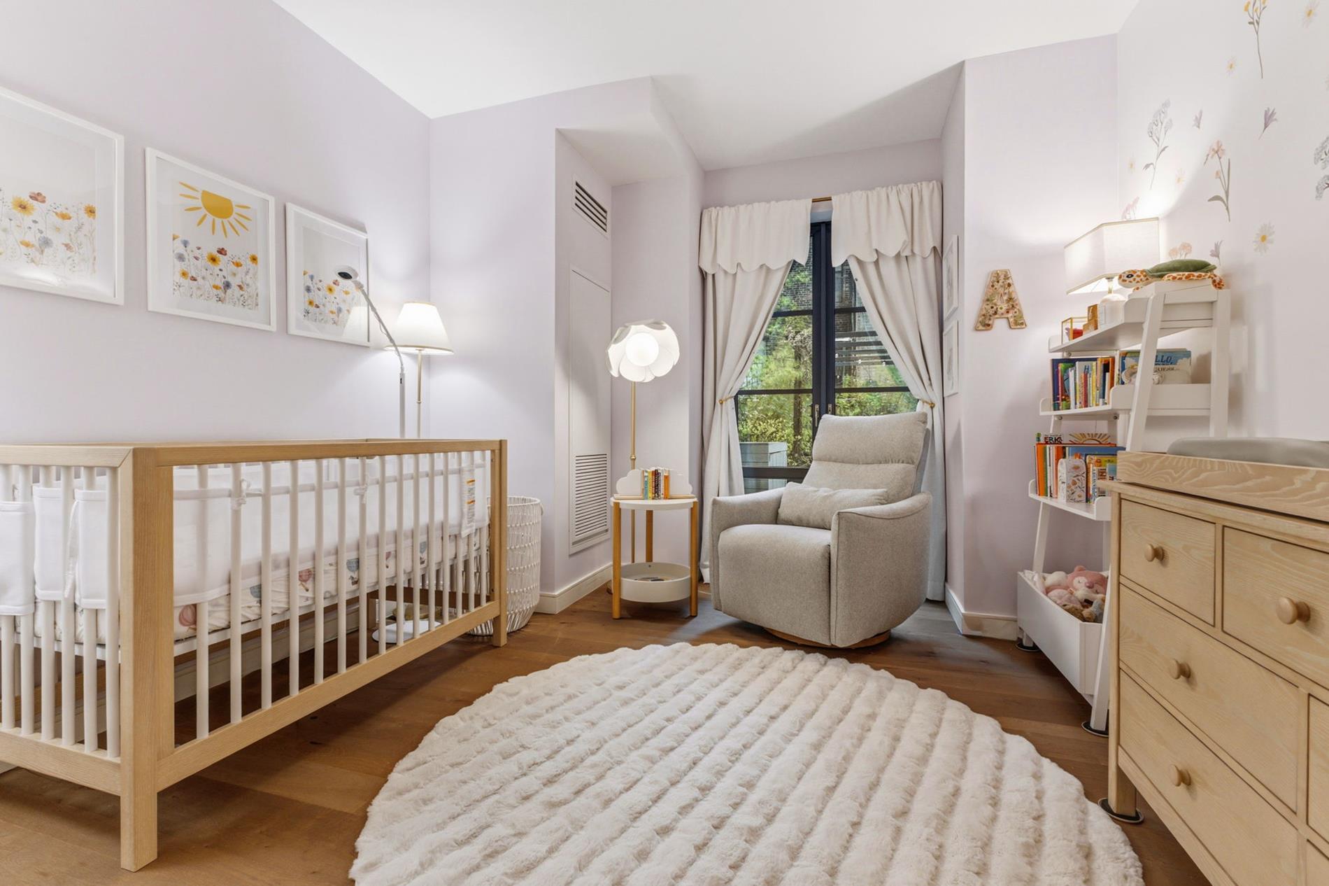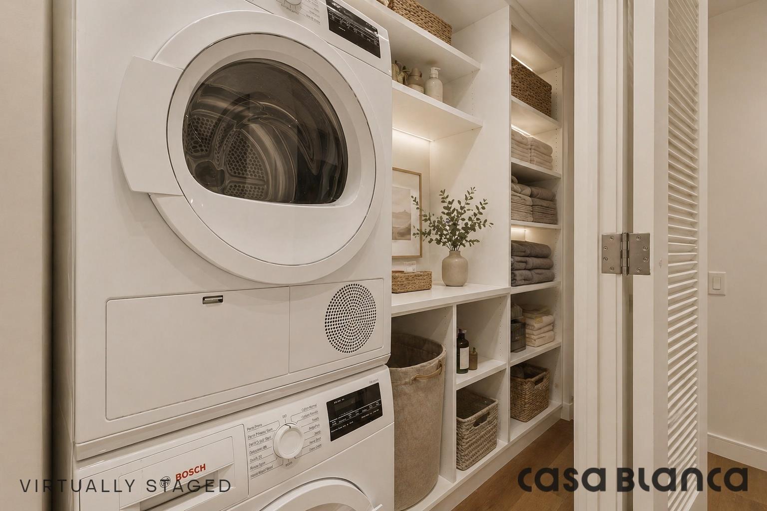 All bedrooms enjoy tranquil garden exposures, enhancing both privacy and natural light. A substantial walk-in closet off the foyer offers exceptional flexibility and can easily be converted into a home office. Additionally, a massive laundry closet provides abundant storage alongside Bosch washer and dryer.