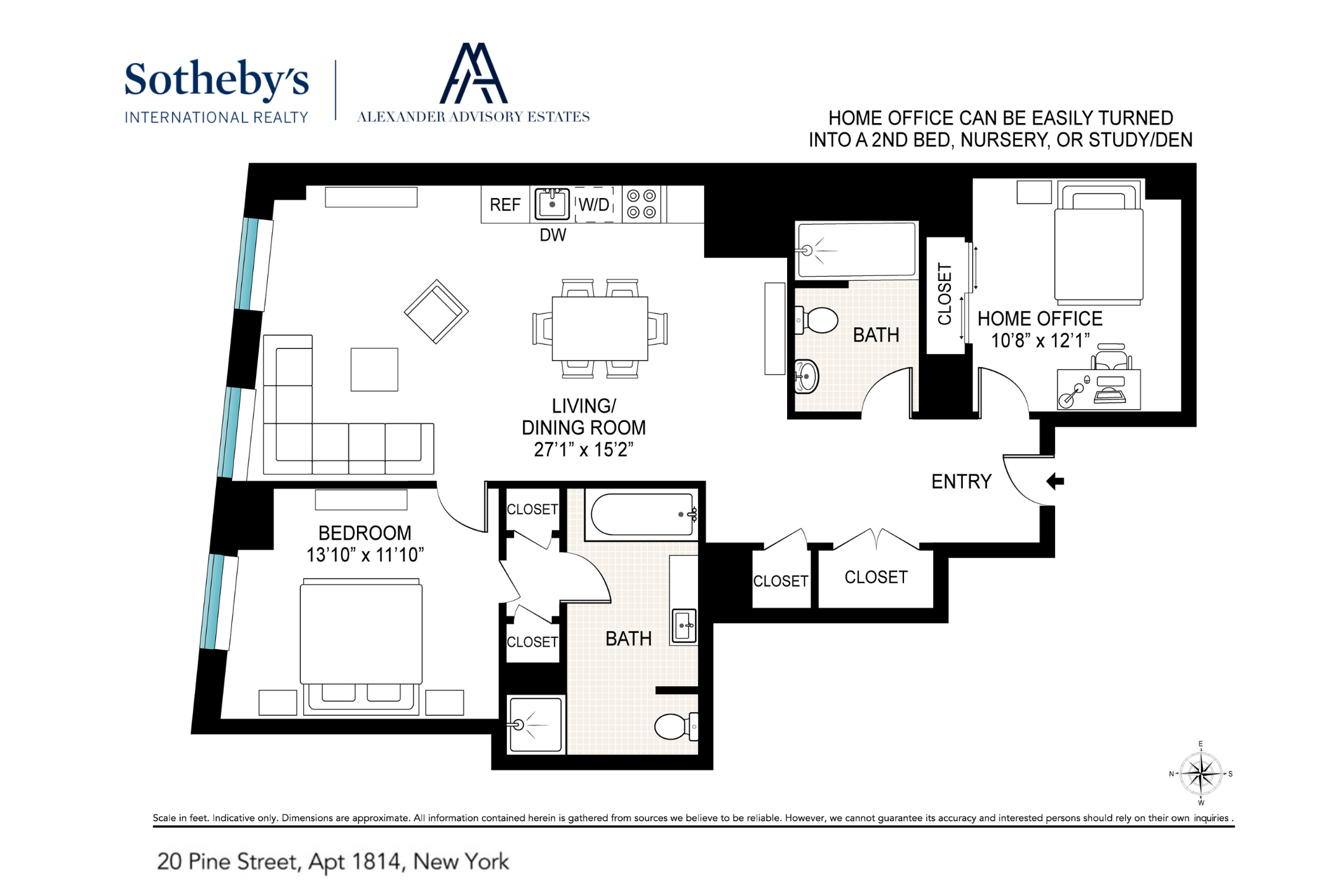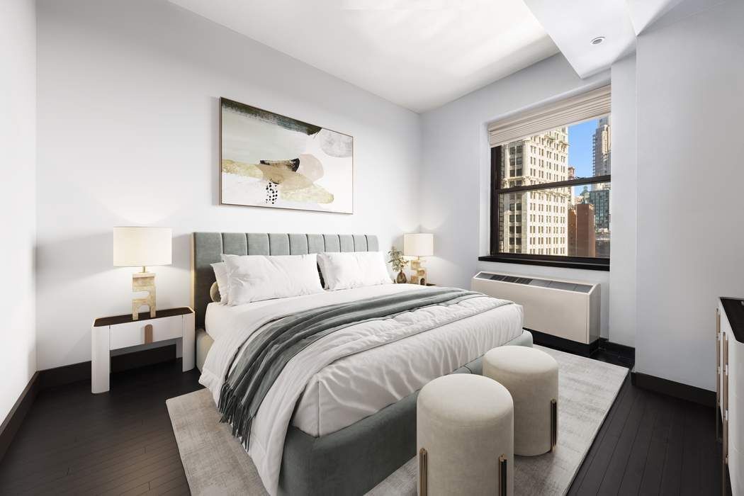 • * PRISTINE CONDITION SUN-FILLED RESIDENCE WITH HIGH CEILINGS* * UPGRADED 1 BEDROOM + DEN | 2 FULL BATHS | 1,204+/- SQ FT* Residence 1814 offers a bright, expansive layout with soaring ceilings and a warm, inviting atmosphere. Spanning 1,204+/- square feet, this home features a wide, open floor plan and an oversized living/dining area with unobstructed views of Chase Manhattan Plaza, filling the space with natural light. The primary suite easily accommodates a king-size bed and includes generous closet space along with a spa-like ensuite bathroom adorned with a rain shower, stone finishes, bronze accents, and exotic woods. A second full bathroom mirrors the same level of luxury. The versatile den functions beautifully as a home office, guest room, nursery, or secondary bedroom, and comfortably fits a queen-size bed. Its thoughtful separation from the primary suite provides additional privacy. Updated Modern finishes and top-tier appliances—including a Sub-Zero refrigerator, Miele oven, and in-unit washer/dryer—are complemented by an open-concept kitchen, ideal for both everyday living and entertaining. Building Amenities 20 Pine offers a full suite of luxury amenities, including: -Rooftop terrace -Residents’ library -60-foot swimming pool -Sauna and steam room -State-of-the-art fitness center -Spa-like facilities throughout Location Nestled in the heart of the Financial District, 20 Pine provides unparalleled access to historic landmarks, world-class shopping, dining, and museums. Residents enjoy private access to the 4 and 5 trains at Wall Street, with the 1, 2, 3, J, Z, and R lines all close by. Some photos have been virtually staged. *Represents current apartment configuration, which may not conform to official legal documentation. Purchasers should consult with their legal or architectural professionals to determine legal use parameters.
