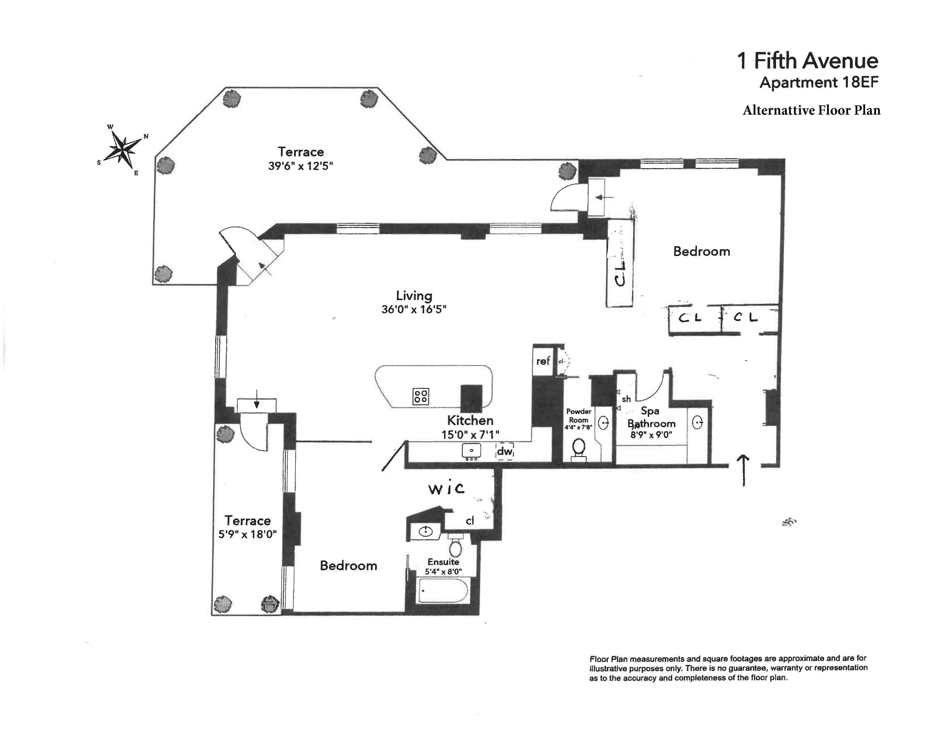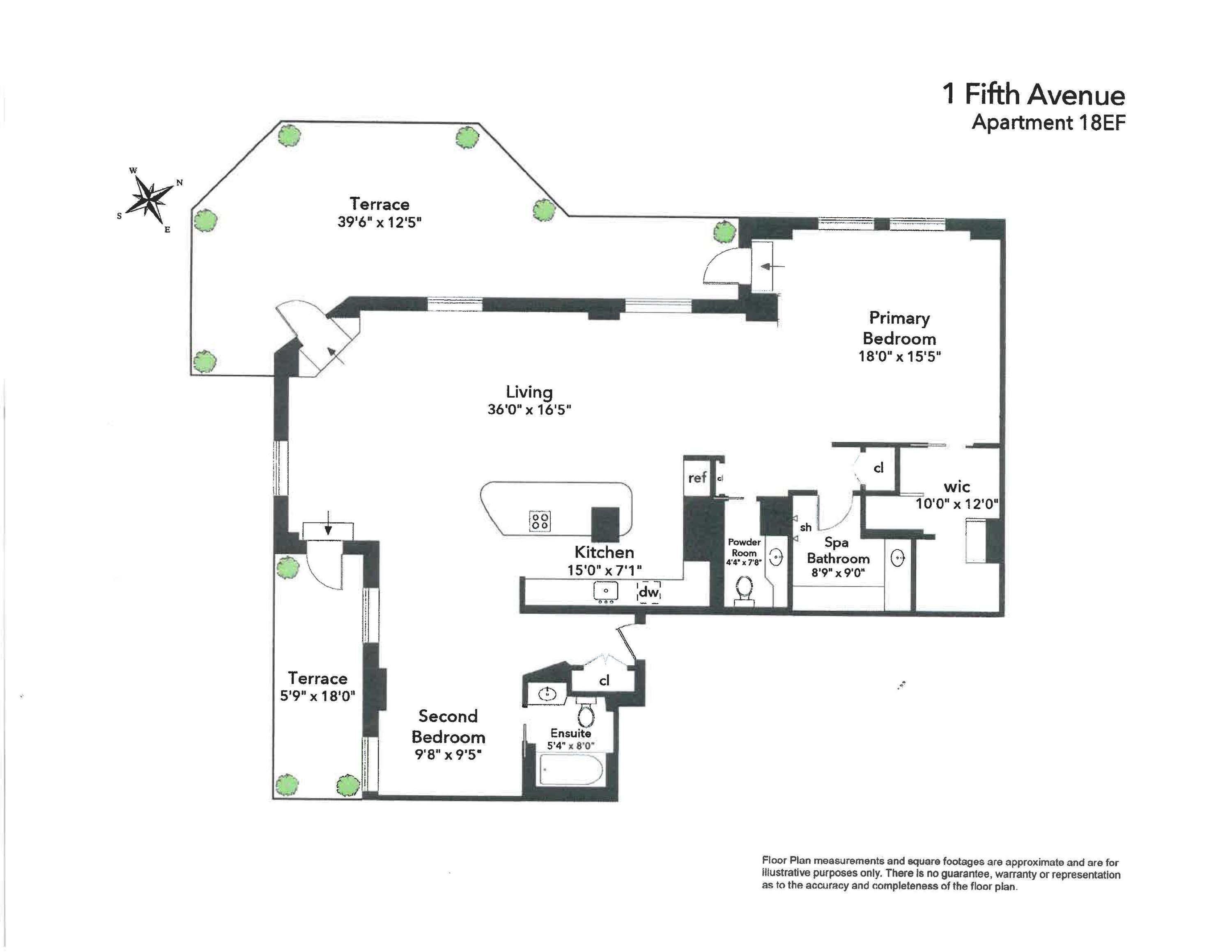Where History Meets Skyline: PH 18EF at One Fifth Avenue Penthouse Perfection with iconic City views! Located in the Tower part of this legendary Art Deco building, Unit 18EF boasts 2 private terraces and endless Manhattan views. Upon arrival, sweeping southern views greet you through oversized pictures windows, while stepping onto the terraces, imposing horizons take your breath away: to the South, from celebrated Washington Square Park expanding beyond the Freedom Tower, to the North, showcasing the Empire State building. While embracing the Art Deco architectural traits of the building, PH 18EF was recently fully redesigned to meet the demand of a contemporary lifestyle: its open-concept floor plan combined with its fascinating views generate an inspiring backdrop seamlessly connected to the city’s most artistic and creative neighborhood. Renovated with highest standards of finishes and attention to details, Penthouse 18EF is a pristine combination of 2 units. Currently set up as an oversized 1 bedroom with 2 baths, it can easily be reverted to 2 bedrooms (see alternative floor plans). Its light- flooded loft-like space comprises a sprawling living-dining area with 3 accesses to the decked terraces, an oversized bar-sitting chef’s kitchen with top-of-the-line appliances, and a bedroom suite with direct entrance to the terrace. Additional features include central A/C and washer/dryer allowed with Board approval. One Fifth Avenue is a legendary Art Deco building located at the entry of Fifth Avenue’s Gold Coast. Its recognizable landmark profile belongs to Washington Square Park views and Greenwich Village’s skyline. Built in 1929 as a luxury hotel by lead design architect Harvey Wiley Corbett, One Fifth Avenue is acclaimed today as one of the most coveted luxury co-ops in all downtown Manhattan. Its magnificent landmark two-story lobby was recently restored and its hallways renovated. His residents enjoy the convenience of having a live-in superintendent, 24-hour doormen. Pied-a-terre allowed. Pet friendly.