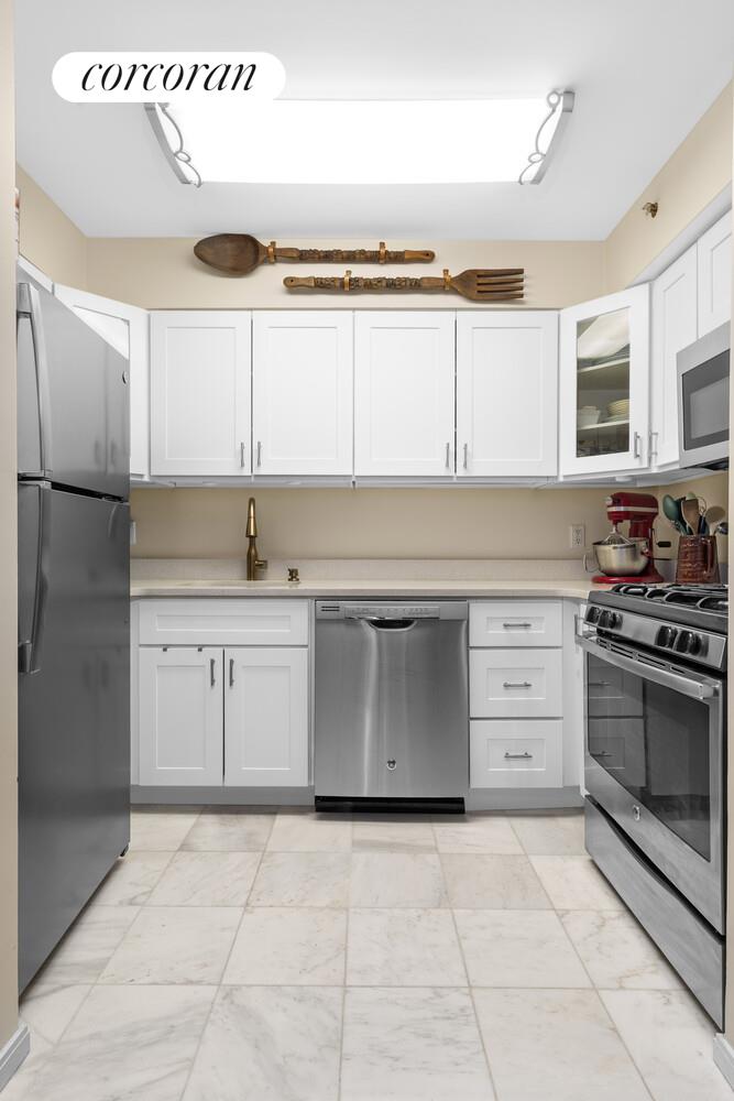 The renovated kitchen features stainless steel appliances and Silestone countertop—designed for those who cook with intention. Recent upgrades elevate everyday living: all three PTAC units were refreshed this year for optimal climate control, custom remote-controlled shades from The Shade Store replace outdated blinds, and a new, more spacious refrigerator completes the kitchen. These aren't cosmetic touches—they're quality-of-life enhancements.