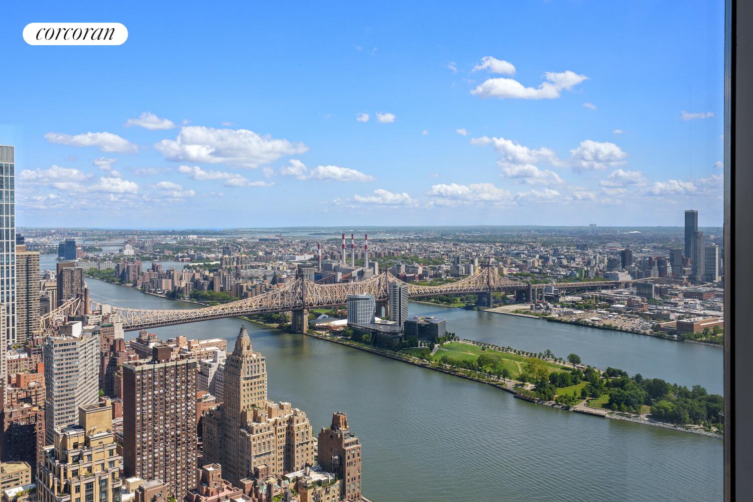 The windowed kitchen is equipped with premium GE appliances, granite countertops, custom cabinetry, and a breathtaking East River view.
