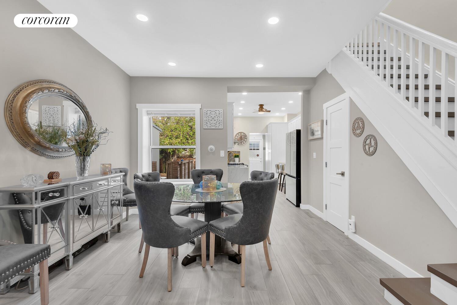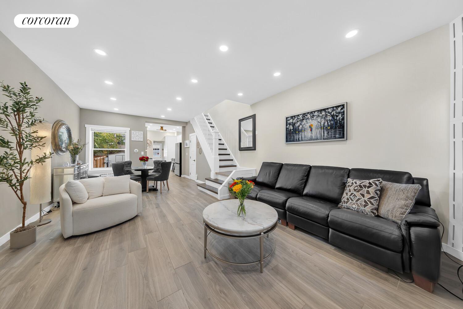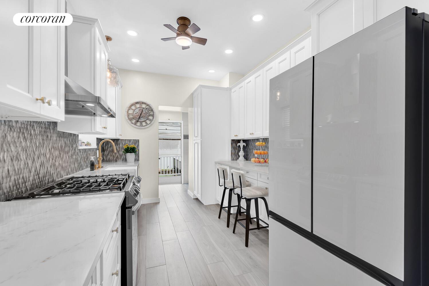 Upon entering, you are greeted by a foyer that leads you to the open-concept living room and dining area, perfect for entertaining or relaxing with family. The parlor floor features a stylish powder room, adding to the home's functionality. The kitchen is a culinary enthusiast's dream, equipped with brand new Samsung Bespoke appliances, including a refrigerator, stove, and dishwasher. The kitchen's design is both practical and beautiful, featuring a farm-style sink, 42-inch upper cabinets, waterfall edge quartz countertops, and a custom glass backsplash. Under-counter lighting enhances the space, making it both inviting and efficient.