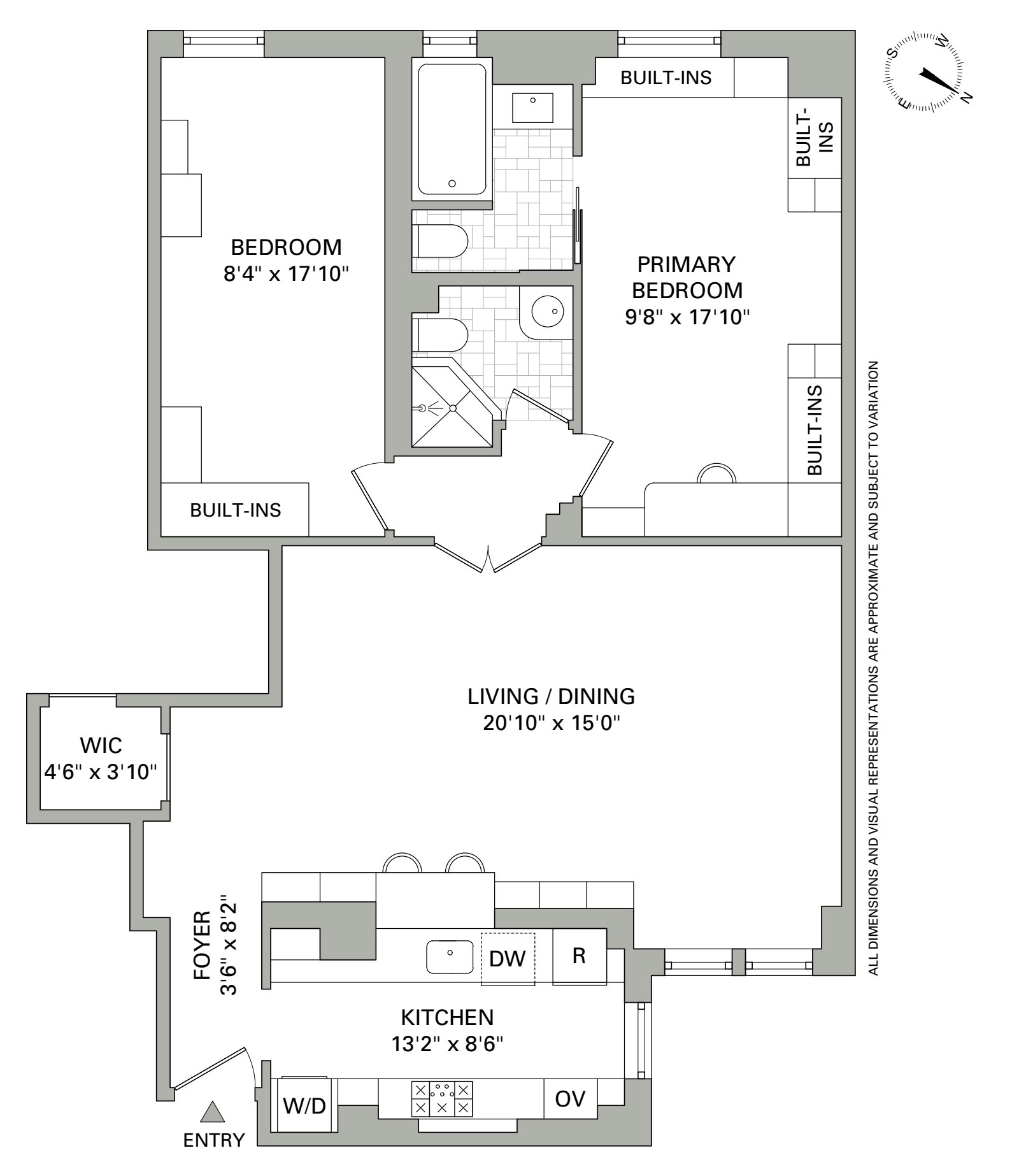 Both spacious bedrooms are south facing, enjoying natural light and a tree lined view, and the primary bedroom includes a windowed en-suite bath with a deep soaking tub. Custom built-ins in each room offer maximum storage, as well as a built-in desk in each room to accommodate your work from home needs. A renovated second bathroom, in-unit W/D, and private storage complete this already fabulous home.