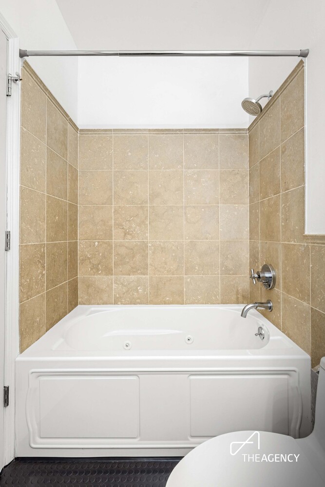 The spa-inspired bathroom features a deep soaking tub with Jacuzzi jets and a wide vanity, offering a luxurious retreat.