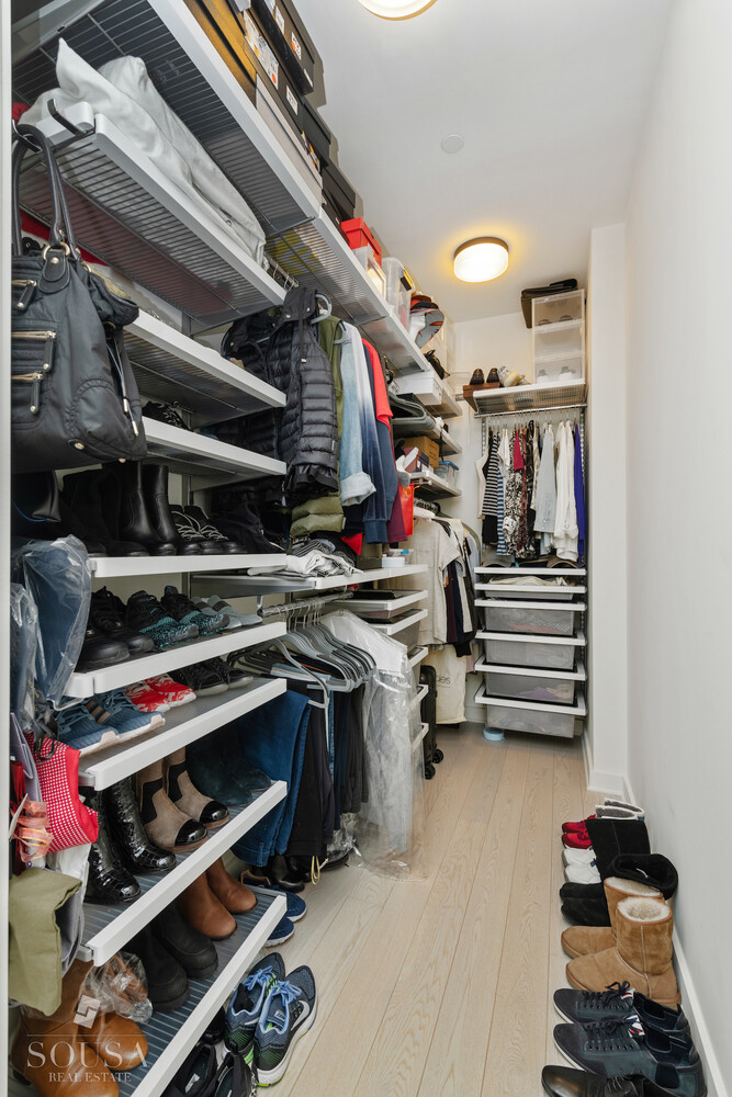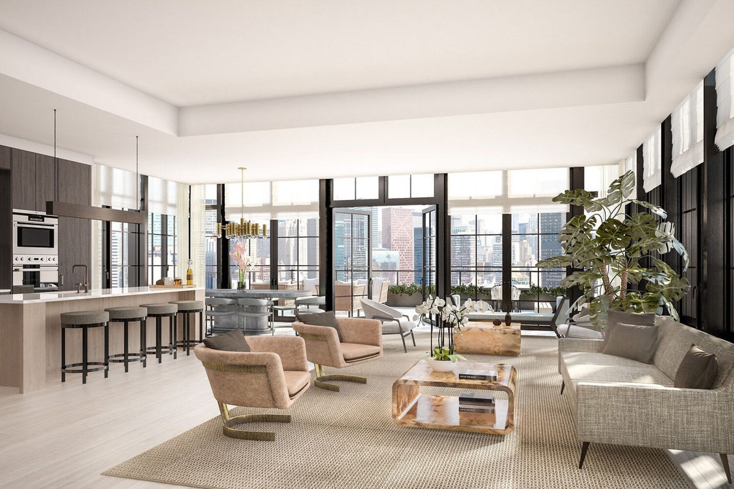 A bright oversized great room with East / South exposures, a dining area for at least six and an open, social kitchen that's ideal for someone who loves to cook. 6" White oak flooring throughout, 10-foot ceilings and 9-foot casement windows. The open kitchen features Gaggenau 4-series appliances, Espekio Blanco glass countertop & backsplash, along with custom kitchen cabinetry by Gold & Reiss. The primary suite with East / North exposures is a tranquil oasis with a walk-in closet (fitted by The Container Store) and a spa like bath with Nero Marquina & Bardiglio marble, herringbone marble flooring, a large stall shower, soaking tub, a double vanity and custom Waterworks fixtures. A gracious 2nd bedroom with Eastern exposure accommodates a queen size bed and has ample closet space. The 2nd bathroom features glazed tiles reminiscent of the Gustavino style tiles of the 59th Street Bridge. Bosch washer / dryer, multiple climate control zones, solar shades and black out shades in both bedrooms are all included.