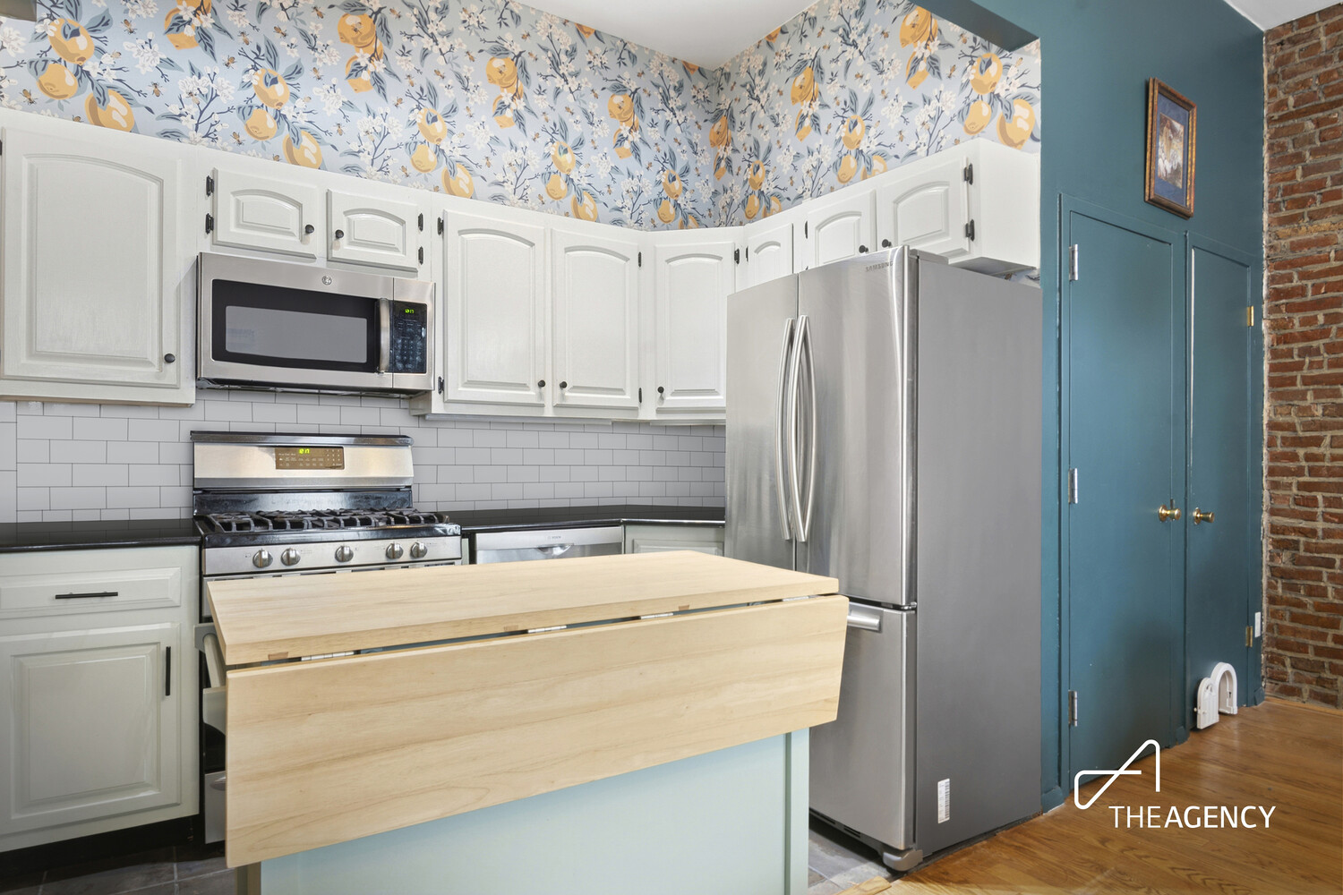 Inside, the expansive living area features exposed brick, hardwood floors, two closets, and oversized north-facing windows that provide excellent natural light. The open-concept kitchen is equipped with stainless steel appliances, ample cabinetry, and generous counter space.