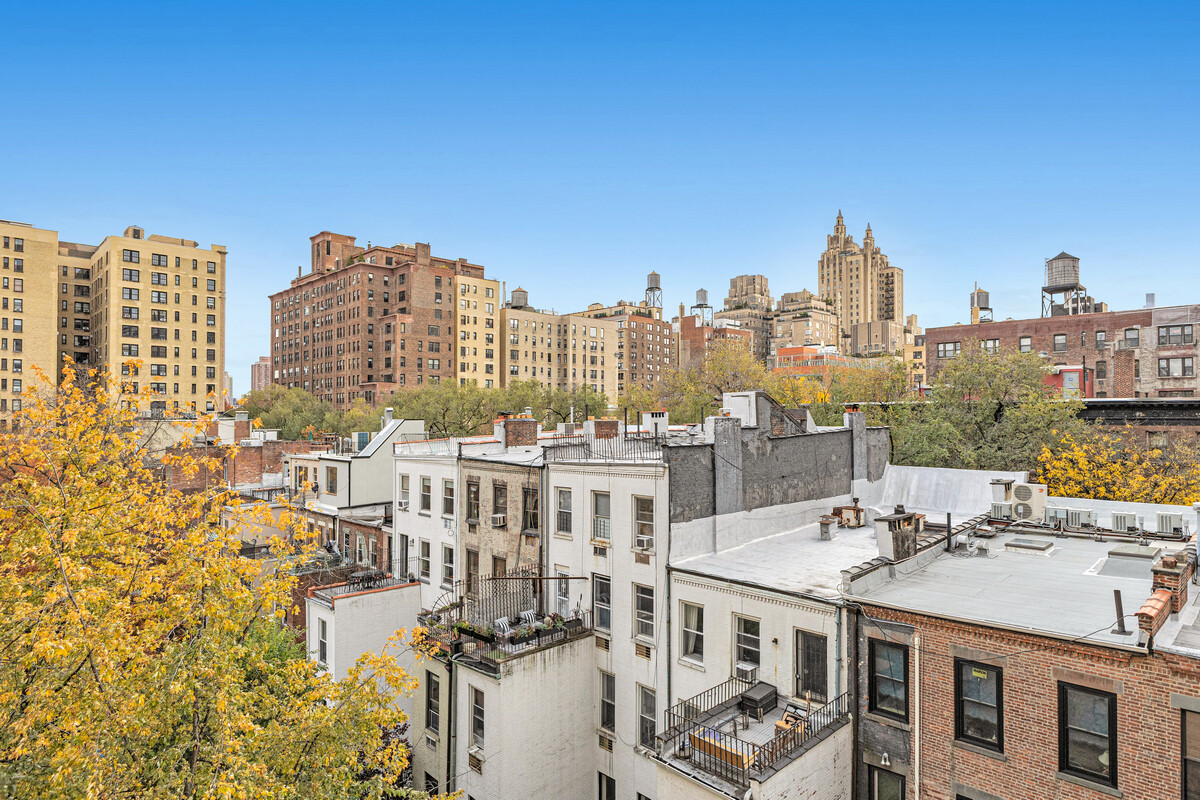 The South-facing living room enjoys tree-top cityscape views across townhouses and the iconic Central Park West skyline including the architecturally significant El Dorado towers.