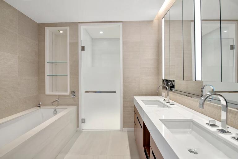 A Scavolini-designed chefs kitchen serves as a true centerpiece, boasting sleek white cabinetry with champagne matte glass accents, Vagli Fine Vein marble countertops and backsplash, and an exceptional suite of premium appliances including a Wolf cooktop and oven, Sub-Zero refrigerator, Gaggenau wine refrigerator, and Miele dishwasher. The serene primary suite offers a spa-caliber en-suite bath wrapped in luxurious stone, featuring a custom Calacatta Fabricotti vanity, carved stone sink, radiant-heated marble floors, a glass-enclosed shower, and a Zuma soaking tub. A striking powder room with a herringbone stone accent wall provides an elegant experience for guests. Additional conveniences include an in-unit washer/dryer and multi-zone climate control.