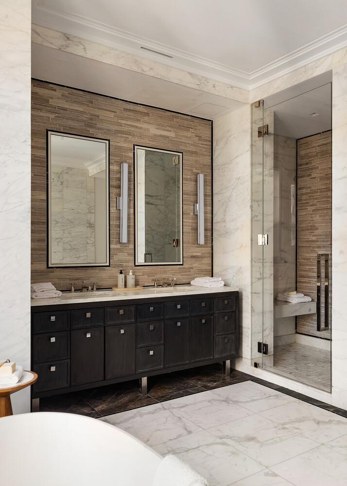 The expansive primary suite, with serene eastern exposures, offers an impressive walk-in closet and a windowed primary bath outfitted with a freestanding soaking tub and an oversized shower enclosed by frameless glass doors. The finishes are a refined composition of Calacatta Gold, Nero Gold, and Tundra Grey marble, complemented by a feature wall of Haisa marble mosaics. Custom cerused and grey-stained white-oak vanity millwork, Calacatta Gold countertops, double vanities with Lefroy Brooks hardware, and radiant heated floors complete this spa-like retreat. An adjacent study adds additional privacy and versatility.