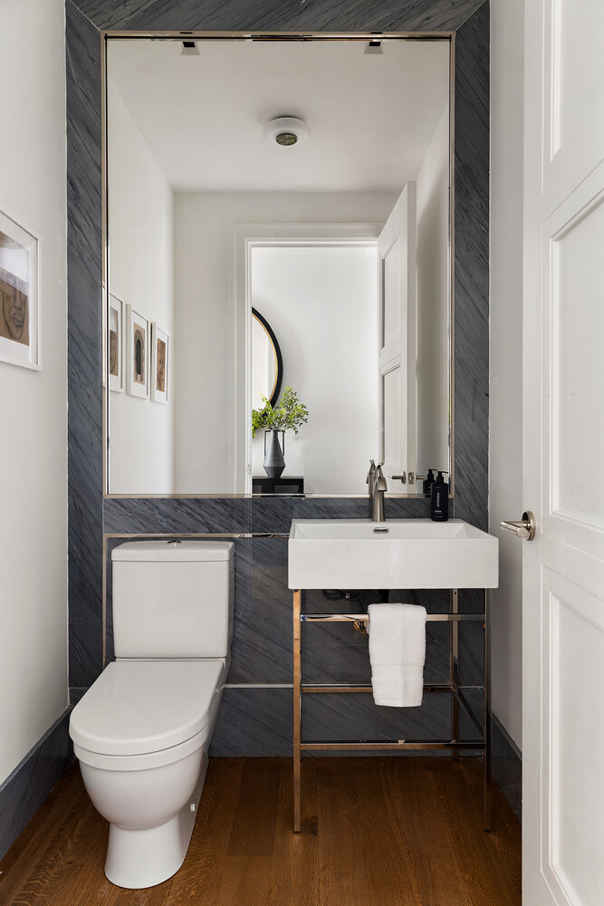 Each bedroom offers generous closet space and an en-suite bathroom with 5-inch rift-and-quartered stained white-oak herringbone floors, a polished nickel vanity pedestal with a Glassos countertop, and Lefroy Brooks polished nickel fixtures and accessories.