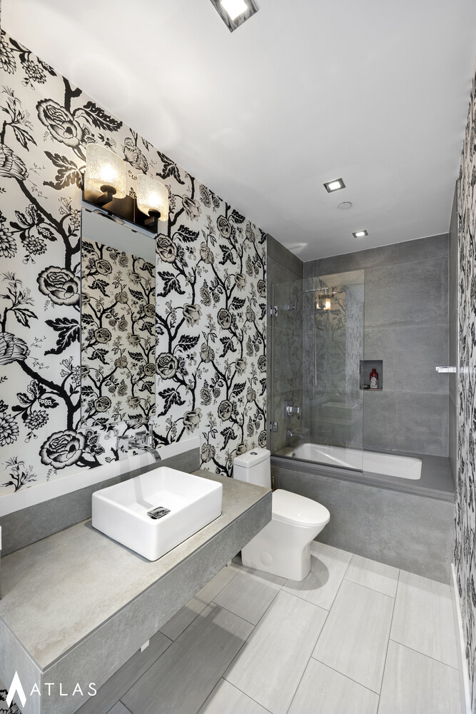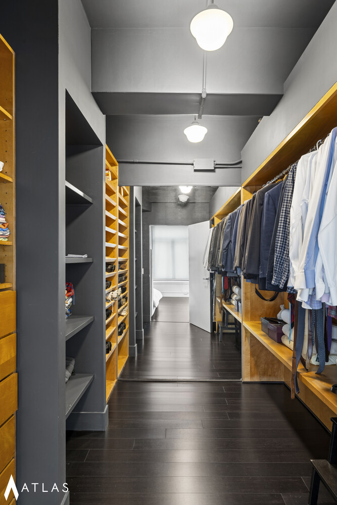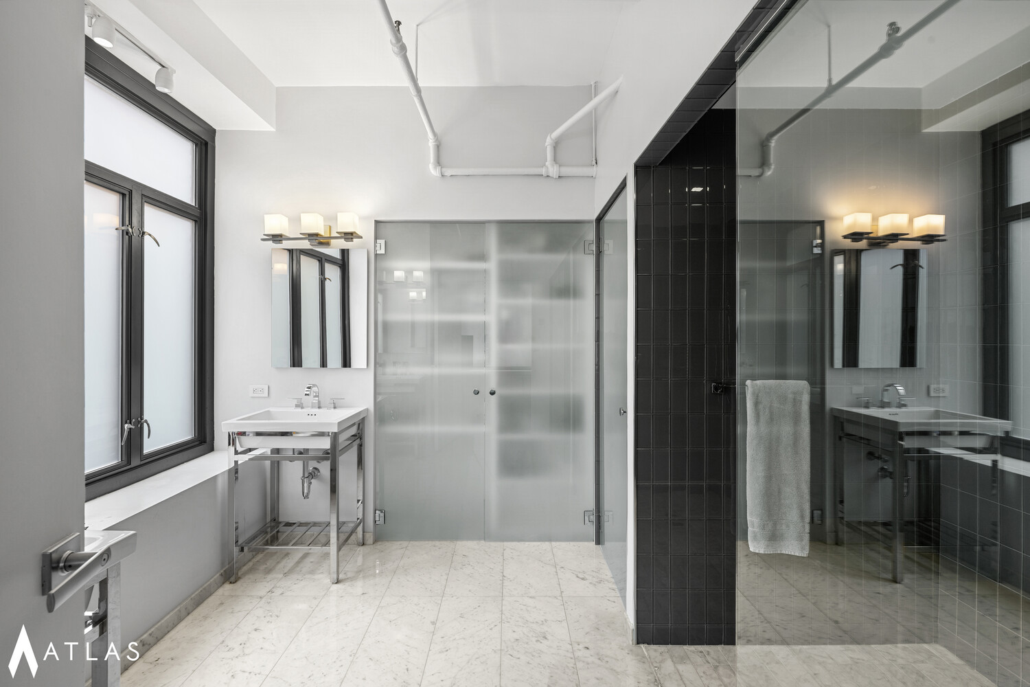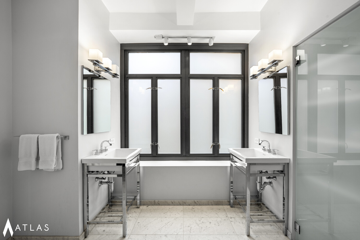 The expansive primary suite captures northern and eastern exposures, filling the room with luminous, shifting light. A grand walk-in closet, crafted with bespoke millwork, offers remarkable storage and architectural clarity. The large ensuite bathroom recalls a European spa with heated floors, an oversized rain shower, and elegant fixtures; an exceptional private retreat.