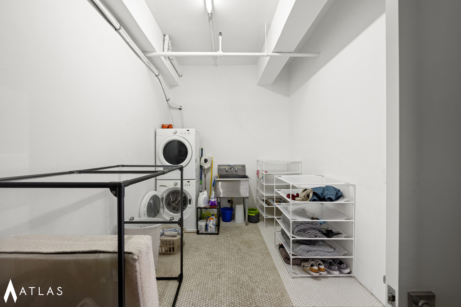 A true New York luxury: a vented laundry room with full-size appliances and a dedicated utility sink. This thoughtful, functional space mirrors the convenience of a standalone home.
