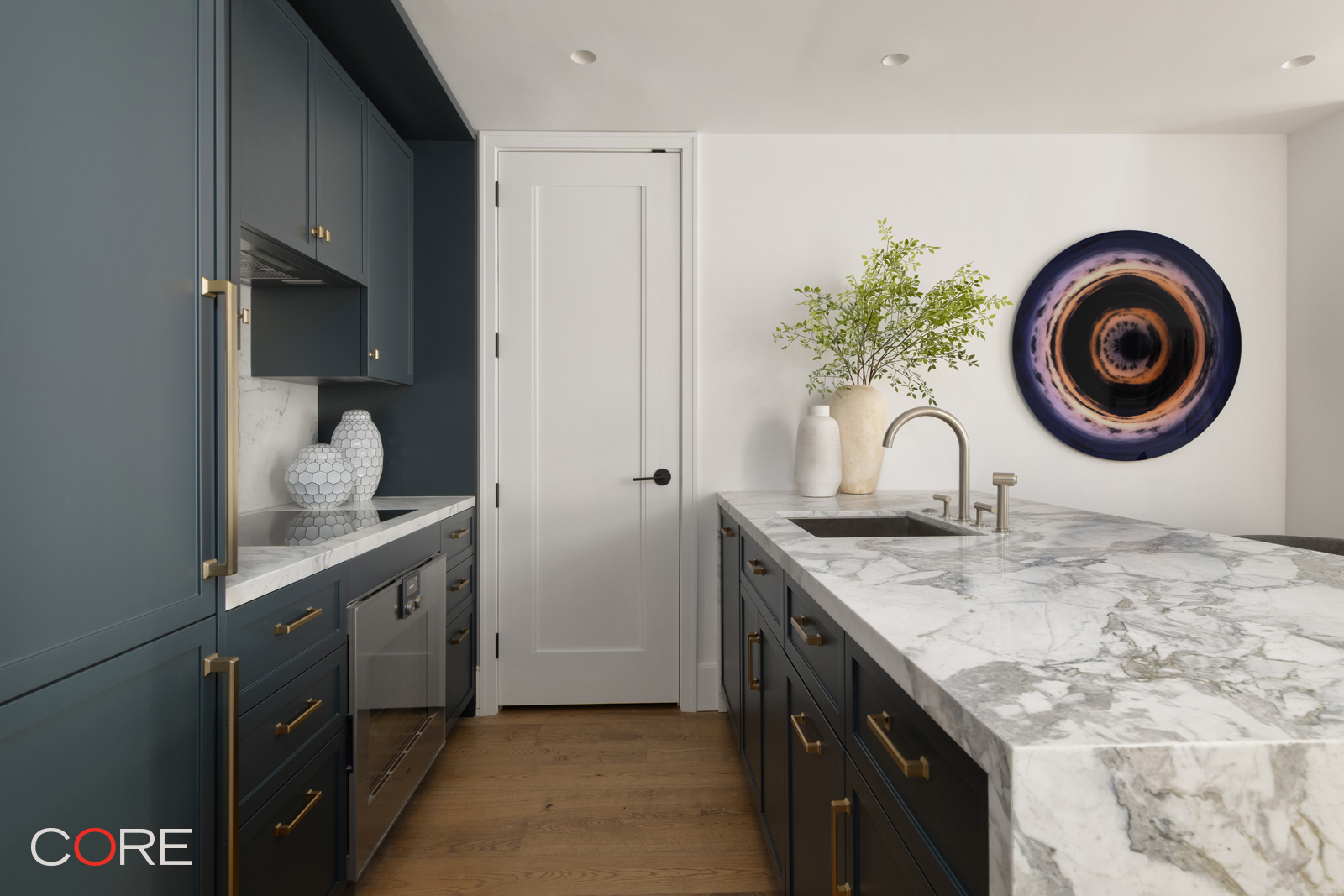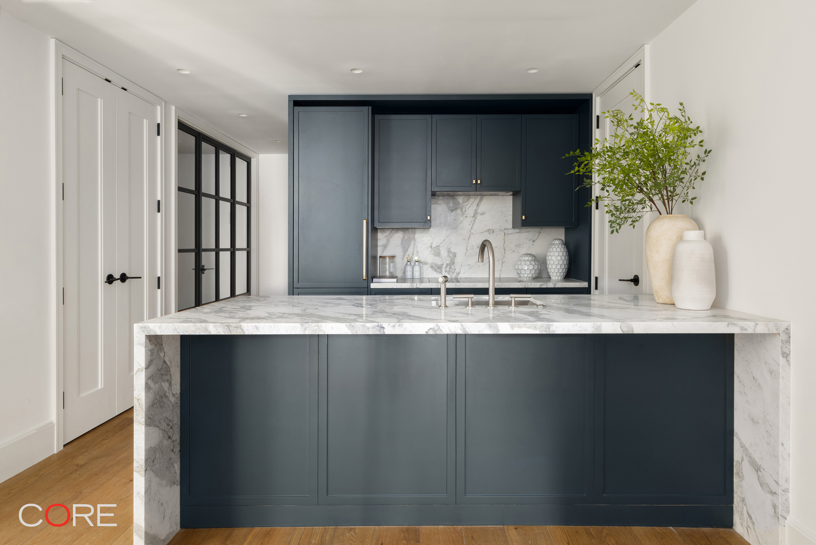 Welcome to Residence 4C at The Village West, a thoughtfully designed one-bedroom, one-bath home with a dedicated home office, created by BKSK Architects and developed by IGI. Upon entering the residence, a versatile home office greets you at the entry, offering the perfect space for work, study, or creative pursuits. Just around the corner, the beautifully appointed kitchen features custom Poliform cabinetry, Picasso Prima Honed stone slab countertops with graceful waterfall edges, and sleek polished Waterworks fixtures. Top-of-the-line appliances, including a Gaggenau cooktop and oven, complete this refined and functional space.