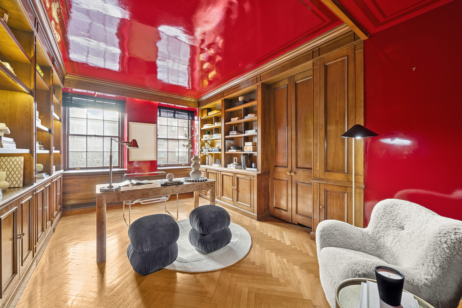 A private elevator landing-accessible only to unit owners-adds an extra layer of security and exclusivity and opens into a gracious gallery, revealing a breathtaking suite of entertaining rooms - each adorned with herringbone floors, rich wood paneling, and two marble fireplace mantles. Every detail exudes warmth and grandeur, from the restored brass hardware to the soaring ceilings that enhance the sense of space and light.
