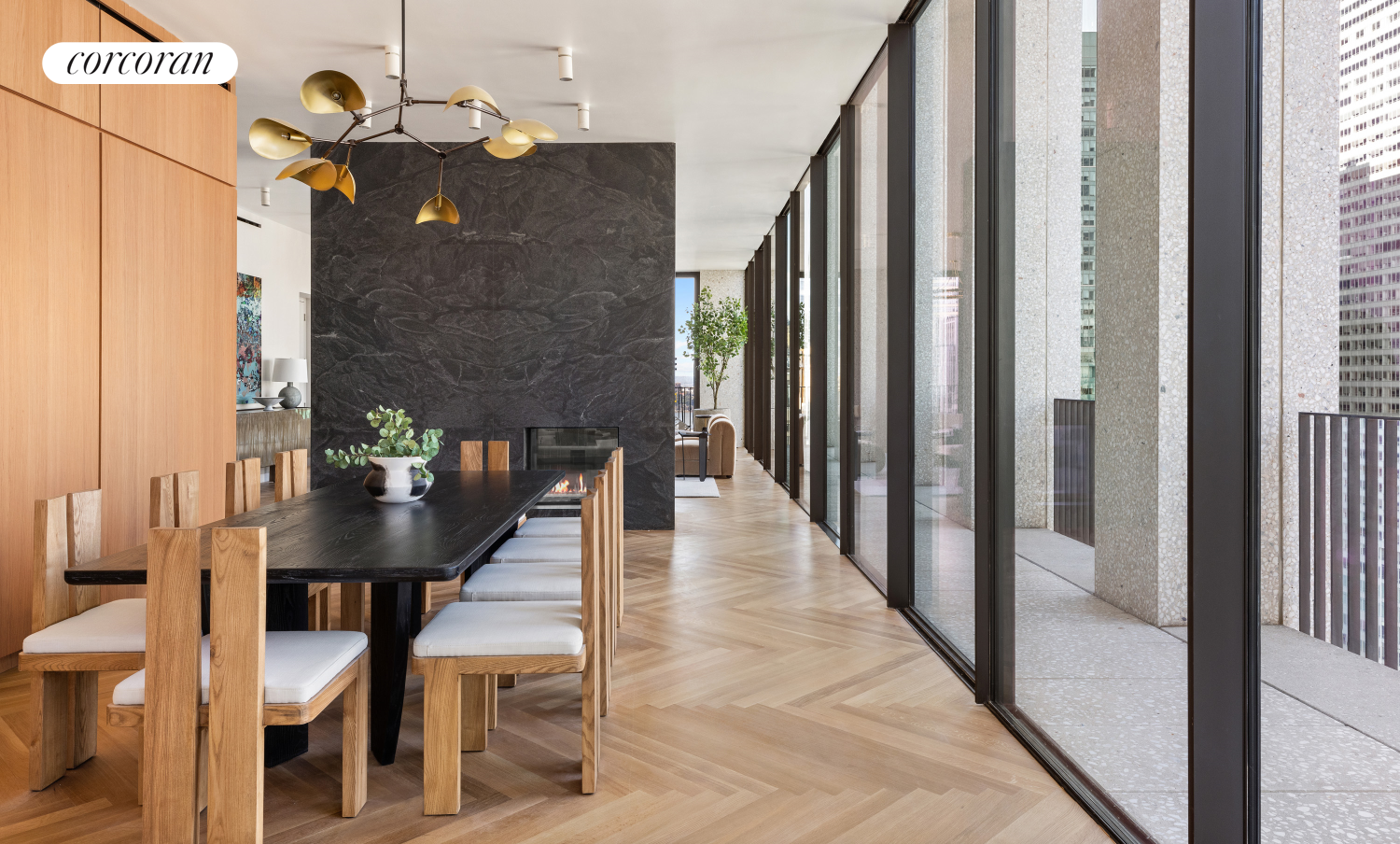 The Bryant's signature marble terrazzo facade wraps all the way to the interiors, framing floor-to-ceiling windows, and transitioning seamlessly to the heated fumed oak herringbone floors with terrazzo border. On the 32nd floor entertaining level, enter into a 70' wide great room with 10'6" ceiling heights, and living and dining areas that are divided by a dramatic Jet Mist granite gas fireplace, open on both sides. Victrosa sliding glass doors span the entirety of the northern exposure, opening onto a double-height colonnade and second terrace. The chef's kitchen features custom designed fumed oak millwork cabinetry and is outfitted with a full suite of Gagganeau and Sub-Zero appliances including a built-in espresso station and integrated full height wine storage. A second prep kitchen is conveniently located next to the service entrance and features an additional cooktop, oven, sink, dishwasher and refrigerator drawers.