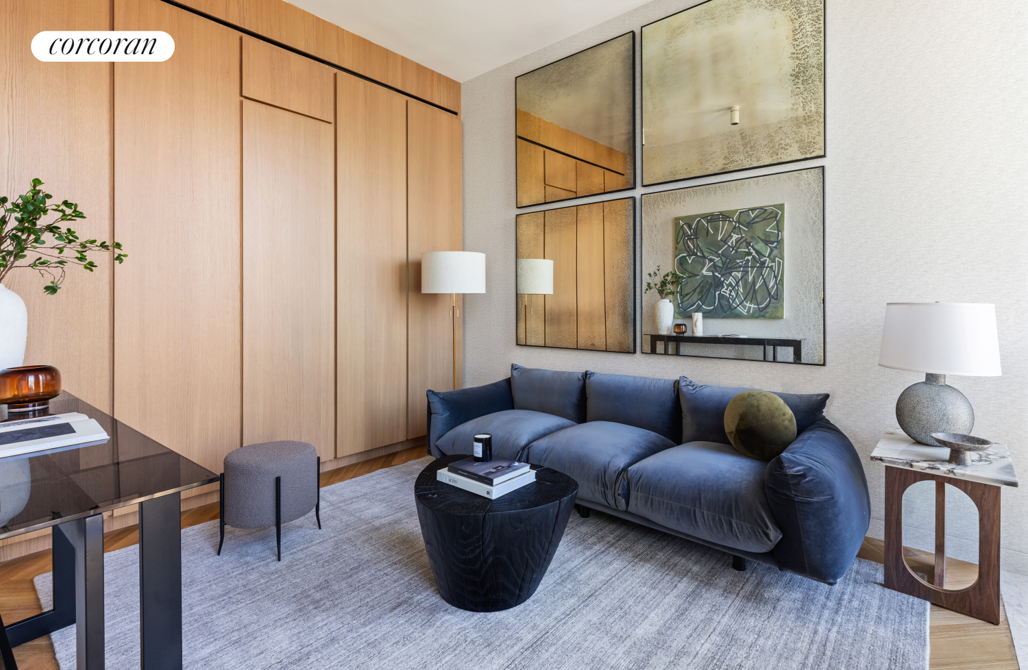 Residences at The Bryant, located at 16 West 40th Street, sit atop a boutique hotel and amenities include a 24-hour attended lobby, lounge, fitness center with sauna, and access to the Branch Club with fireplace and full bar overlooking Bryant Park.
