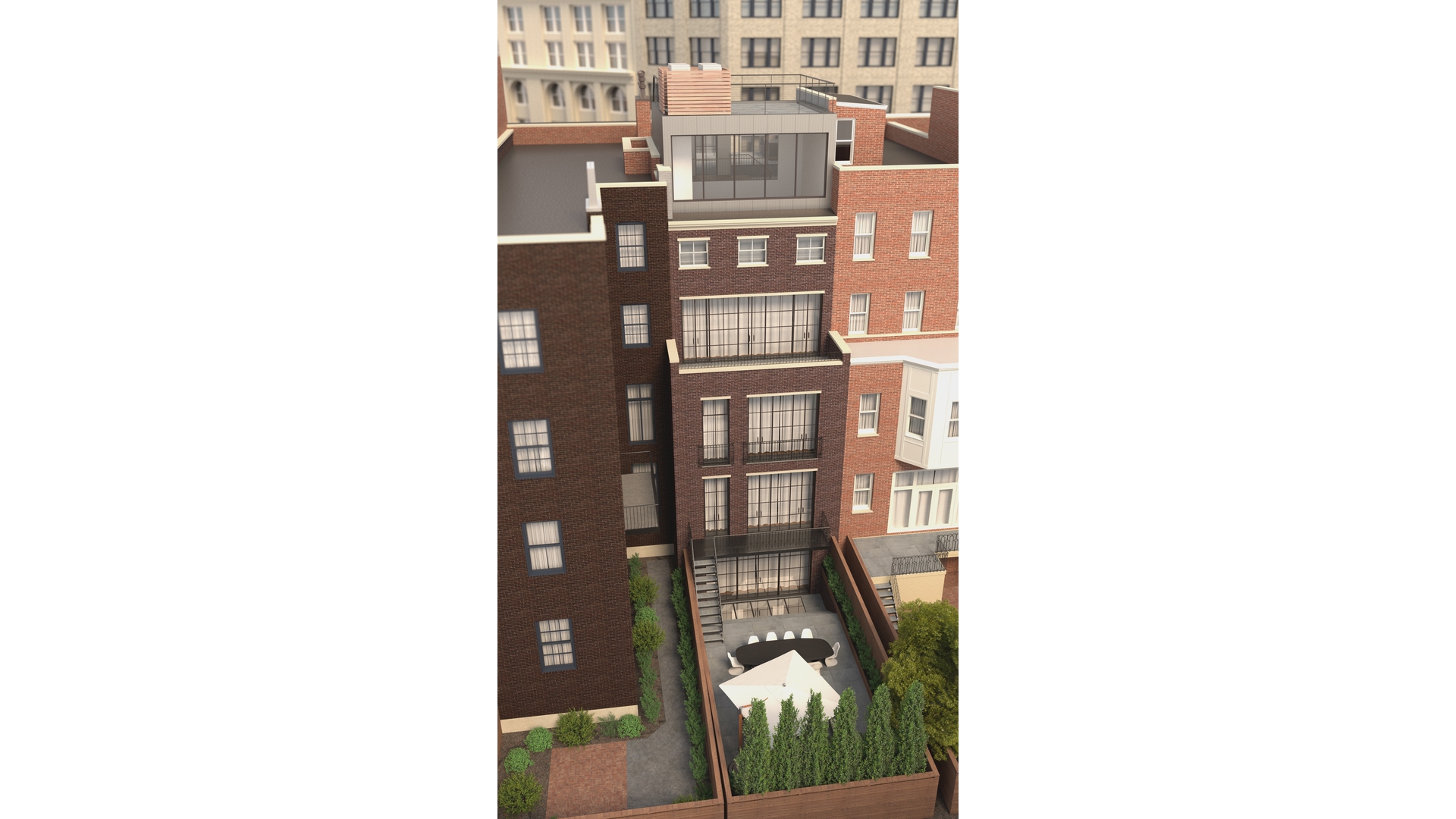 The approved plans envision a dramatic seven-story mansion featuring a rooftop extension, a fully excavated cellar with a home gym and theater, a spectacular roof deck, and four additional distinct outdoor spaces, transforming the property into a one-of-a-kind Greenwich Village mansion.