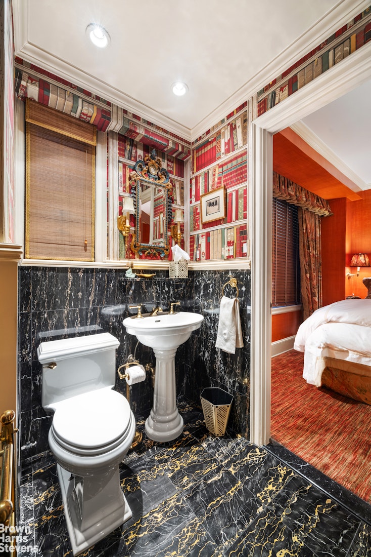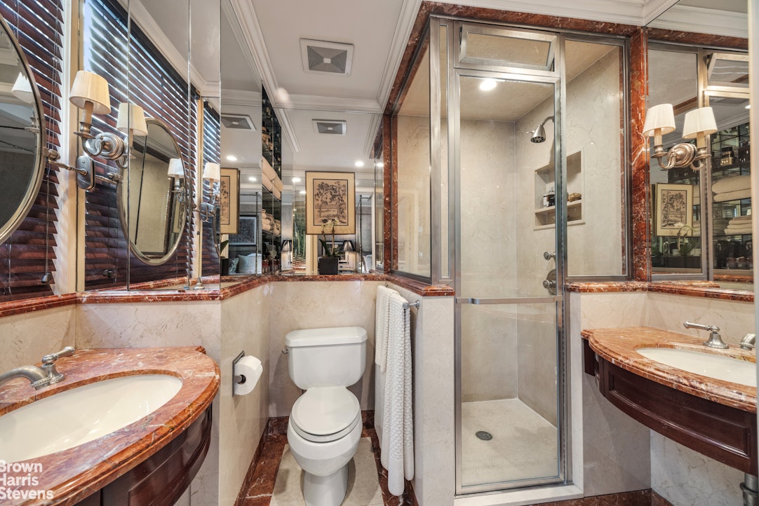 Both bedrooms are tucked away through a separate corridor that includes two closets, one of which houses an in-unit Miele washer and dryer. The north-facing king-sized primary bedroom is bright and airy with luscious carpeting and wallpaper. Its four-fixture ensuite bathroom has two distinct vanities, and there is an exceptionally large walk-in closet. The adjacent, south-facing second bedroom has an ensuite Jack-and-Jill bathroom that is also conveniently accessible from the main gallery for any guests to utilize.