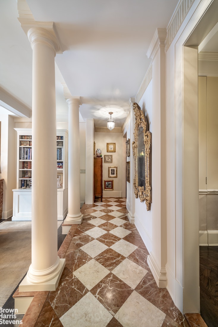 As you enter the foyer with a dedicated coat closet, a checkered marble floor provides a runway into the home and overlooks the grand sunken living room that is flanked with columns beneath 10'6"-high beamed ceilings. Exquisitely refined millwork in the form of custom built-ins as well as crown and baseboard molding surround the room, anchored around a central stunning chandelier perfectly situated. The true focal point of this room, however, is the timeless wood burning fireplace with a marble mantel.