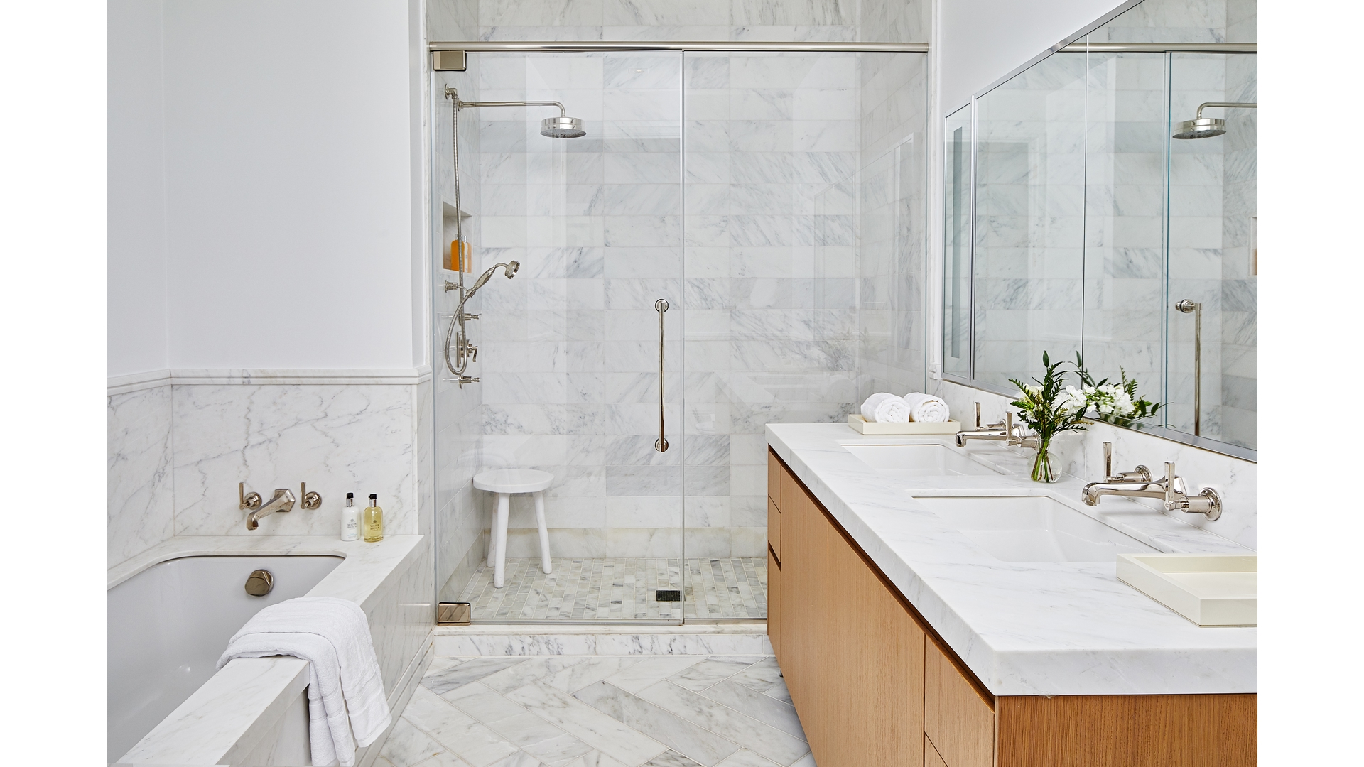 The primary suite offers a generous walk-in closet and a luxurious marble-clad bath with double vanity, enclosed shower, freestanding Duravit soaking tub, and radiant heated floors. Additional features include a washer and vented dryer, multi-zone HVAC system, prewiring for automated shades, and recessed LED lighting throughout.