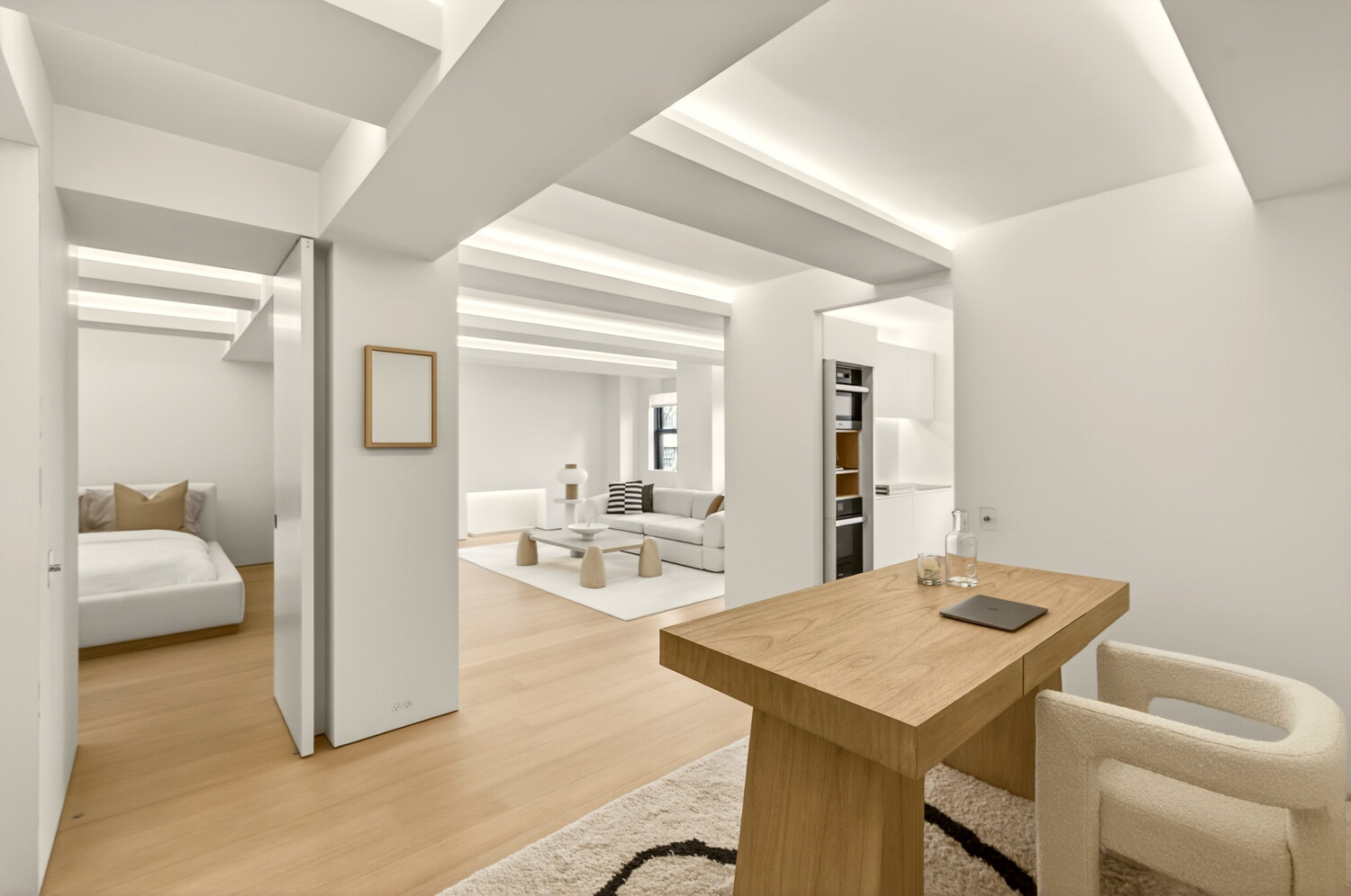 Ultramodern and style converge in this thoughtfully renovated Scandinavian-inspired residence at 235 E 49th Street, where pre-war character meets refined modern design by S.K. Mukherjee. This move-in-ready home showcases meticulous craftsmanship with clean architectural lines, hidden ambient lighting, and custom finishes such as flush-wall outlets and shadow gaps that create a seamless, gallery-like aesthetic. The windowed kitchen is both functional and visually striking, featuring fully upgraded Miele appliances, Corian surfaces, and custom matte lacquer cabinetry, while the spa-like bath is finished in Turkish limestone with radiant heated floors, a walk-in shower, and premium fixtures. Designed for comfort and efficiency, the home includes upgraded HVAC discreetly built into custom millwork and seven well-planned closets offering exceptional storage. With three exposures-South, West, and North-the residence enjoys an abundance of natural light along with views of gardens, townhouses, and the surrounding cityscape. Located in a boutique co-op with a roof deck, attentive staff, and flexible purchasing options, this property is well-suited for discerning buyers seeking a design-forward primary residence or pied-à-terre in Midtown East.