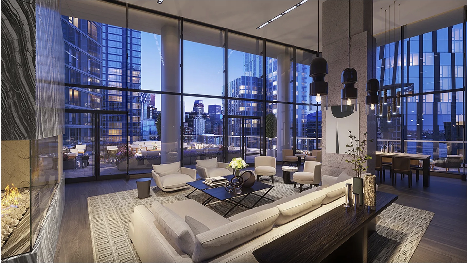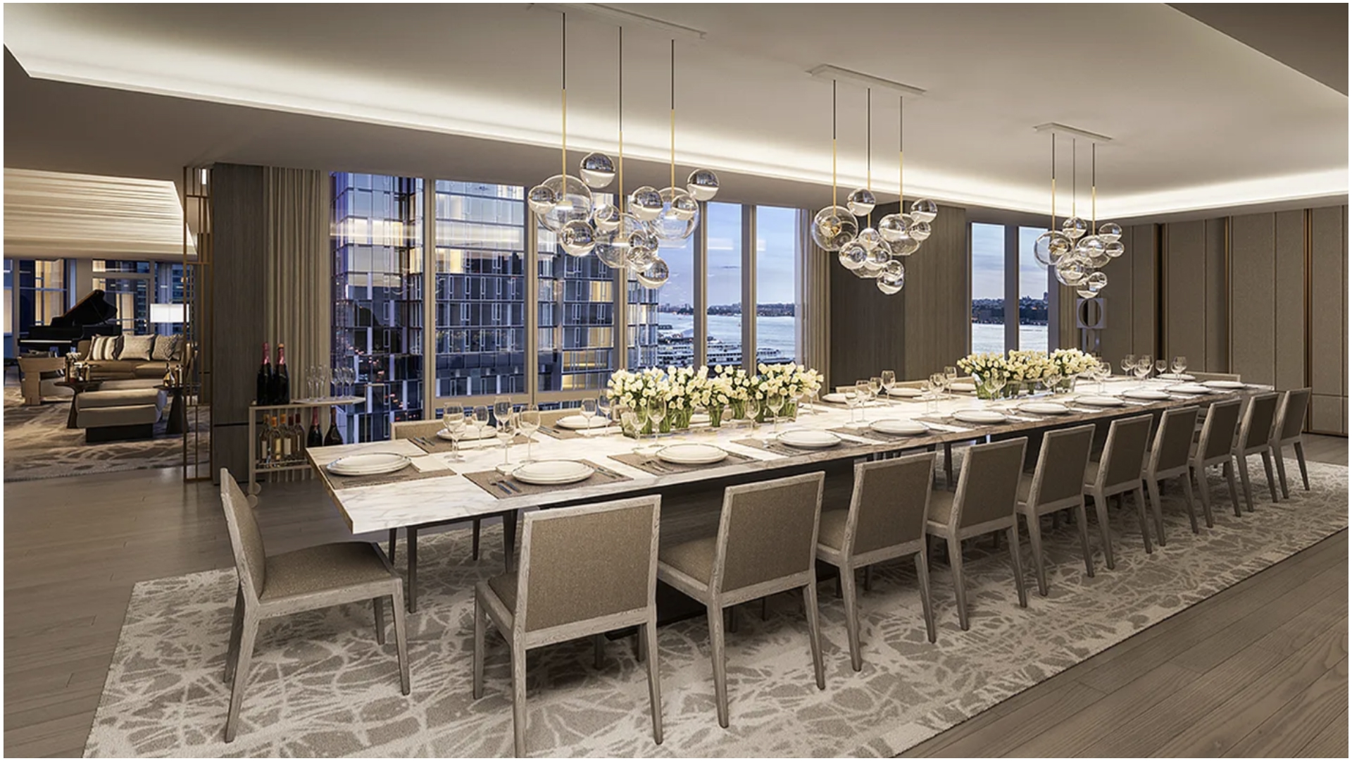 Residents of Two Waterline Square enjoy private condominium amenities on the 18th floor, including a 22- seat dining room with catering kitchen, lounge with river-view balcony, media room, billiards room with bar, and a great room with fireplace that opens to a 3,700- square- foot landscaped sundeck with two outdoor kitchens .