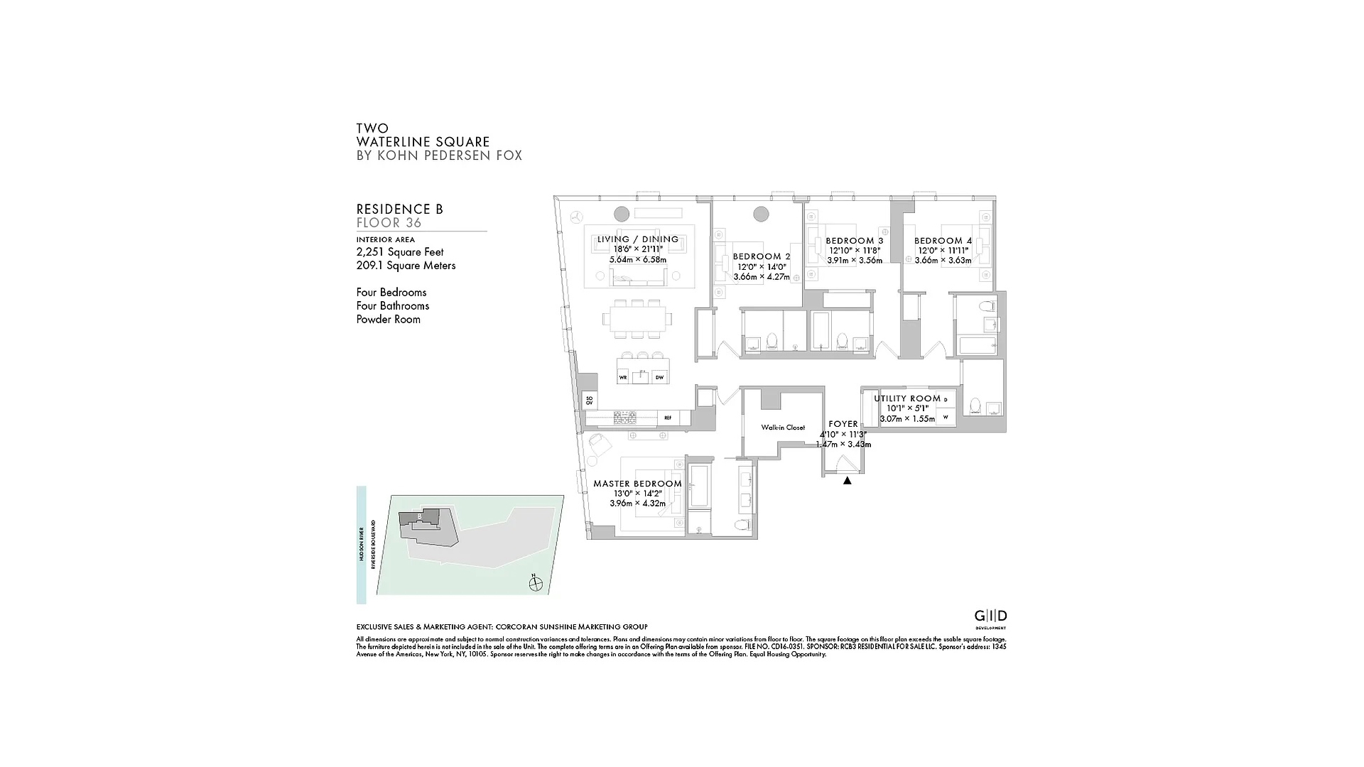 Designed by Kohn Pedersen Fox , Two Waterline Square rises with a striking cascading facade that maximizes its riverfront setting. The building is part of the vibrant Waterline Square community spanning a full city block along Riverside Boulevard between West 60th and 61st Streets, where three architecturally distinct towers surround a beautifully curated park.