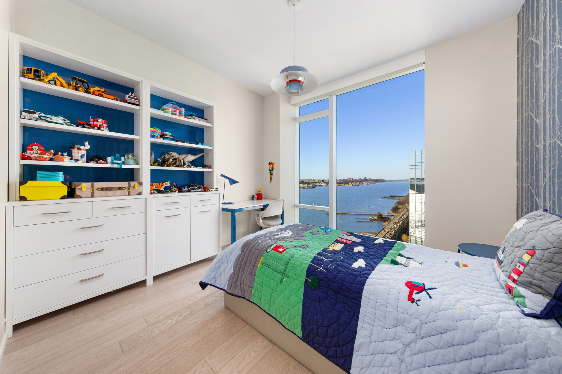 Capturing sweeping views of the Hudson River to the west and the George Washington Bridge to the north, this exceptional four-bedroom, four-and-a-half-bathroom residence at Two Waterline Square is framed by floor-to-ceiling windows in every room, filling the home with natural light and delivering spectacular sunsets over the river .