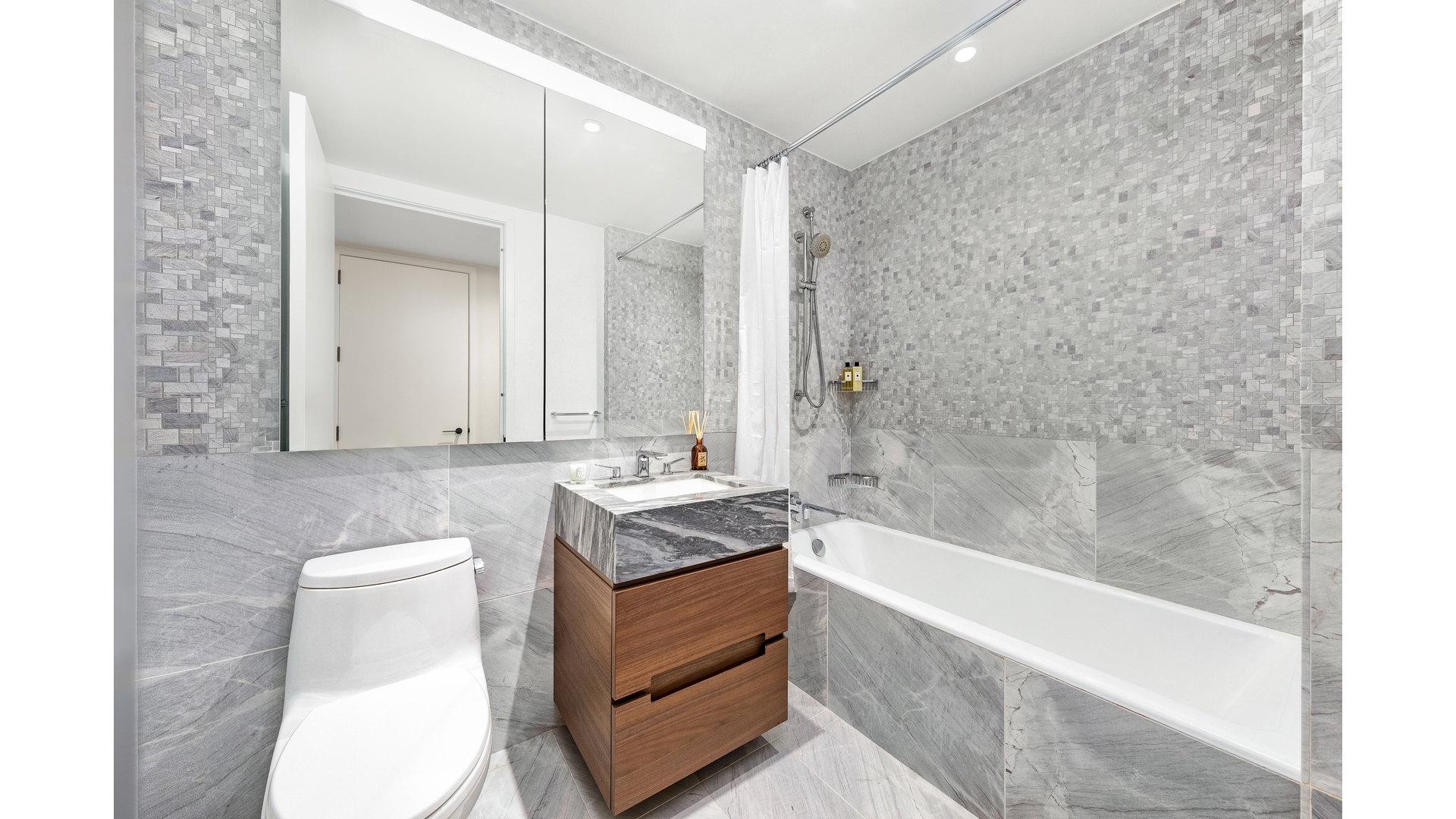 One of only six four-bedroom residences in the building, the home features soaring ceilings and thoughtful upgrades throughout, including custom millwork in the living room designed for both entertainment and additional storage, as well as bespoke millwork in the primary bedroom suite. Custom closets have been installed in every bedroom, and motorized shades are featured throughout the home for both comfort and convenience.