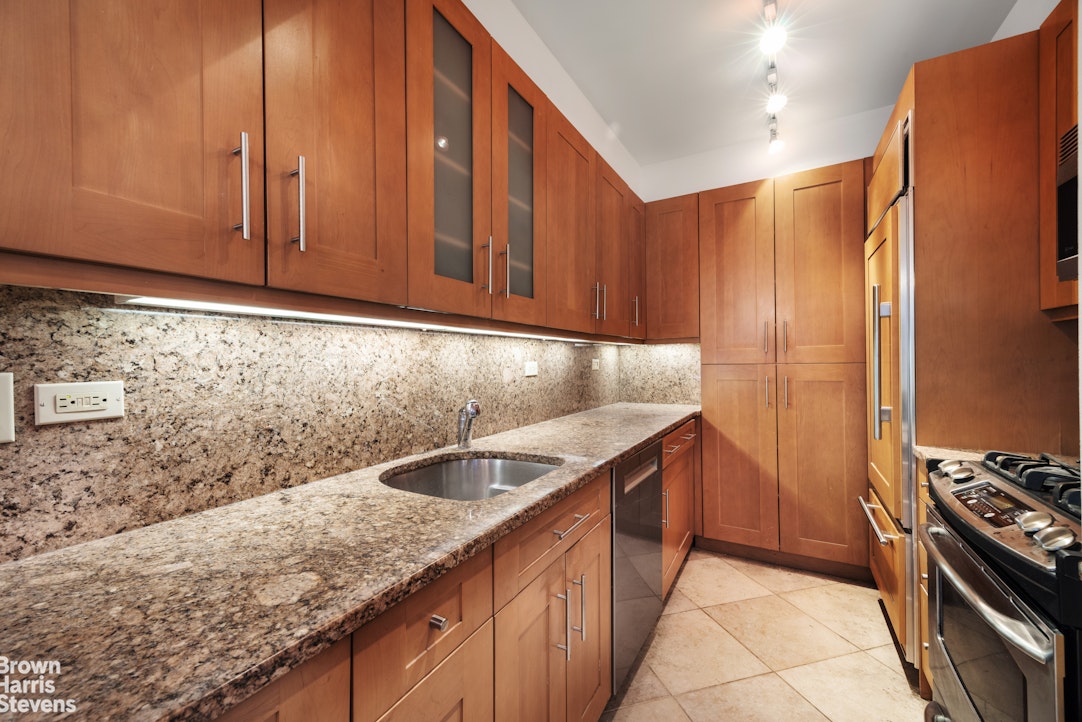 Off the living room is a generously sized dining area that leads straight into the kitchen, which features granite countertops, plenty of cabinetry, under-cabinet lighting, and stainless steel appliances, including a dishwasher and a paneled Sub-Zero refrigerator.